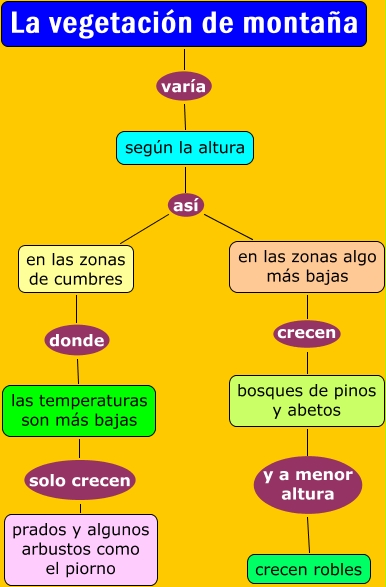 Este Cmap, tiene información relacionada con: La vegetación de montaña, según la altura así en las zonas algo más bajas, las temperaturas son más bajas solo crecen prados y algunos arbustos como el piorno, La vegetación de montaña varía según la altura, bosques de pinos y abetos y a menor altura crecen robles, en las zonas algo más bajas crecen bosques de pinos y abetos, según la altura así en las zonas de cumbres, en las zonas de cumbres donde las temperaturas son más bajas