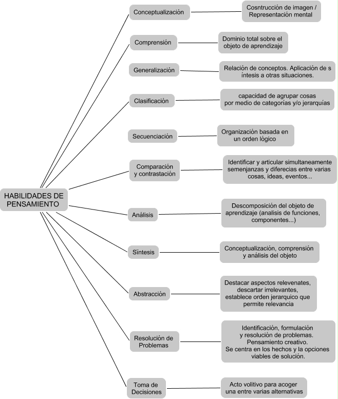 Este Cmap, tiene información relacionada con: HABILIDADES DE PESAMIENTO, Sïntesis Conceptualización, comprensión y análisis del objeto, HABILIDADES DE PENSAMIENTO Comparación y contrastación, HABILIDADES DE PENSAMIENTO Clasificación, Secuenciación Organización basada en un orden lógico, HABILIDADES DE PENSAMIENTO Sïntesis, HABILIDADES DE PENSAMIENTO Toma de Decisiones, Resolución de Problemas Identificación, formulación y resolución de problemas. Pensamiento creativo. Se centra en los hechos y la opciones viables de solución., Comparación y contrastación Identificar y articular simultaneamente semenjanzas y diferecias entre varias cosas, ideas, eventos..., HABILIDADES DE PENSAMIENTO Resolución de Problemas, Análisis Descomposición del objeto de aprendizaje (analisis de funciones, componentes...), Conceptualización Cosntrucción de imagen / Representación mental, HABILIDADES DE PENSAMIENTO Análisis, Toma de Decisiones Acto volitivo para acoger una entre varias alternativas, Abstracción Destacar aspectos relevenates, descartar irrelevantes, establece orden jerarquico que permite relevancia, Clasificación capacidad de agrupar cosas por medio de categorías y/o jerarquías, Generalización Relación de conceptos. Aplicación de s íntesis a otras situaciones., HABILIDADES DE PENSAMIENTO Comprensión, HABILIDADES DE PENSAMIENTO Conceptualización, Comprensión Dominio total sobre el objeto de aprendizaje, HABILIDADES DE PENSAMIENTO Abstracción