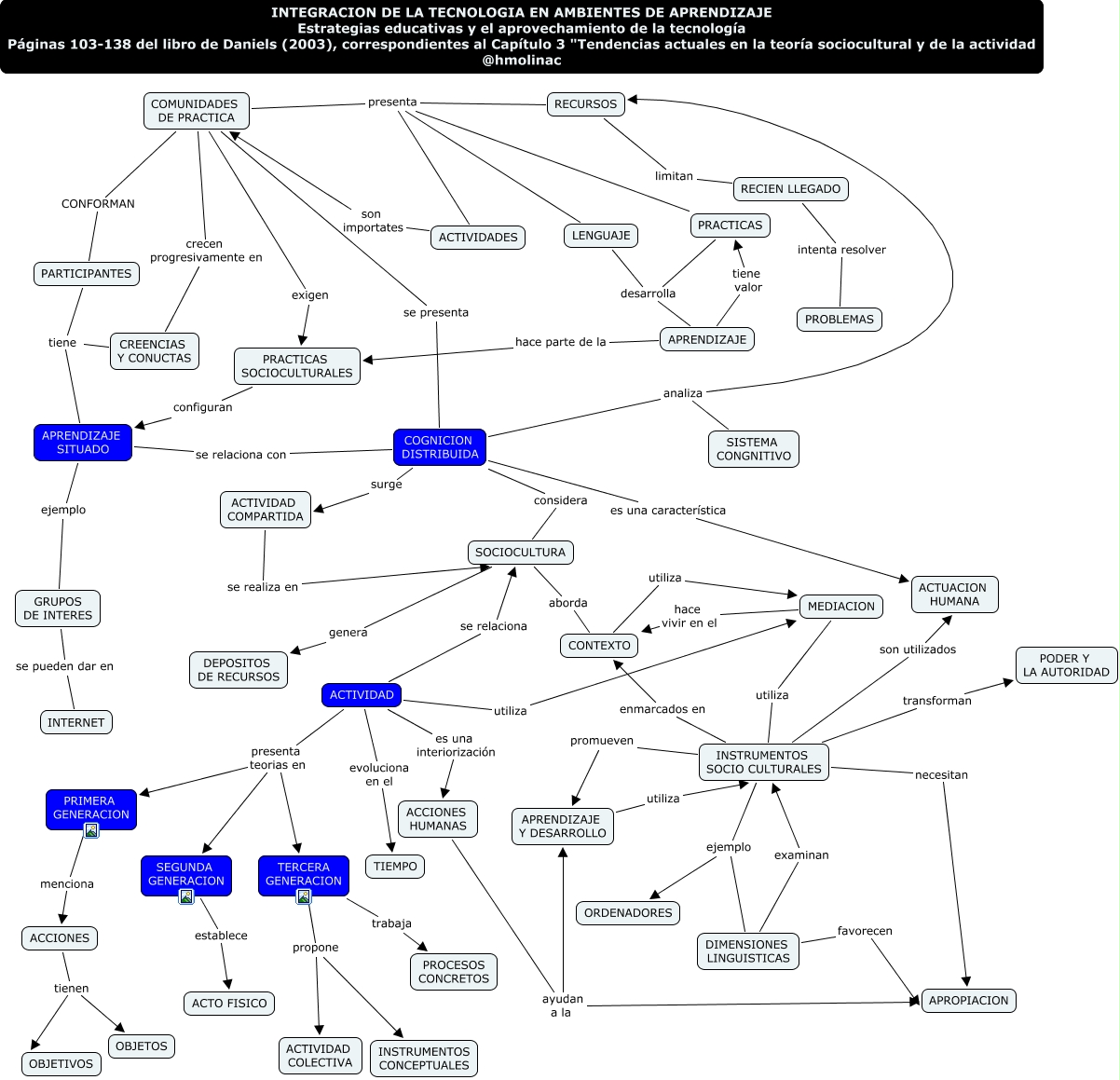 Este Cmap, tiene información relacionada con: APRENDIZAJE SITUADO, COMUNIDADES DE PRACTICA se presenta COGNICION DISTRIBUIDA, ACTIVIDAD es una interiorización ACCIONES HUMANAS, CONTEXTO utiliza MEDIACION, ACCIONES tienen OBJETIVOS, COMUNIDADES DE PRACTICA presenta ACTIVIDADES, INSTRUMENTOS SOCIO CULTURALES promueven APRENDIZAJE Y DESARROLLO, ACTIVIDAD COMPARTIDA se realiza en SOCIOCULTURA, PARTICIPANTES CONFORMAN COMUNIDADES DE PRACTICA, COGNICION DISTRIBUIDA analiza RECURSOS, SOCIOCULTURA genera DEPOSITOS DE RECURSOS, DIMENSIONES LINGUISTICAS examinan INSTRUMENTOS SOCIO CULTURALES, APRENDIZAJE tiene valor PRACTICAS, ACTIVIDAD presenta teorias en PRIMERA GENERACION, APRENDIZAJE SITUADO ejemplo GRUPOS DE INTERES, PRACTICAS desarrolla APRENDIZAJE, APRENDIZAJE SITUADO se relaciona con COGNICION DISTRIBUIDA, INSTRUMENTOS SOCIO CULTURALES ejemplo ORDENADORES, RECURSOS limitan RECIEN LLEGADO, COGNICION DISTRIBUIDA surge ACTIVIDAD COMPARTIDA, TERCERA GENERACION propone INSTRUMENTOS CONCEPTUALES