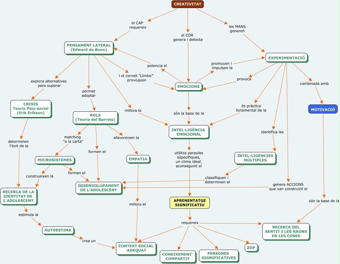 Este Cmap, tiene información relacionada con: Gral_CREATIVITAT, APRENENTATGE SIGNIFICATIU requereix RECERCA DEL SENTIT I LES RAONS DE LES COSES, PENSAMENT LATERAL (Edward de Bono) explora alternatives para superar CRISIS Teoria Psio-social (Erik Erikson), AUTOESTIMA crea un CONTEXT SOCIAL ADEQUAT, APRENENTATGE SIGNIFICATIU requereix CONEIXEMENT COMPARTIT, ROLS (Teoria del Barrets) afavoreixen la EMPATIA, EMOCIONS són la base de la INTEL·LIGÈNCIA EMOCIONAL, EXPERIMENTACIÓ identifica les INTEL-LIGENCIES MÚLTIPLES, EMOCIONS promouen i impulsen la EXPERIMENTACIÓ, APRENENTATGE SIGNIFICATIU requereix ZDP, EMOCIONS potencia el PENSAMENT LATERAL (Edward de Bono), PENSAMENT LATERAL (Edward de Bono) i el cervell "Límbic" provoquen EMOCIONS, APRENENTATGE SIGNIFICATIU requereix CONTEXT SOCIAL ADEQUAT, INTEL-LIGENCIES MÚLTIPLES classifiquen i determinen el DESENVOLUPAMENT DE L'ADOLESCENT, EXPERIMENTACIÓ és pràctica fonamental de la INTEL·LIGÈNCIA EMOCIONAL, MICROSISTEMES construeixen la RECERCA DE LA IDENTITAT DE L'ADOLESCENT, RECERCA DE LA IDENTITAT DE L'ADOLESCENT estimula la AUTOESTIMA, CREATIVITAT el COR genera i detecta EMOCIONS, INTEL·LIGÈNCIA EMOCIONAL utilitza paraules específiques, un clima ideal, aconseguint el APRENENTATGE SIGNIFICATIU, APRENENTATGE SIGNIFICATIU requereix PERSONES SIGNIFICATIVES, PENSAMENT LATERAL (Edward de Bono) millora la INTEL·LIGÈNCIA EMOCIONAL