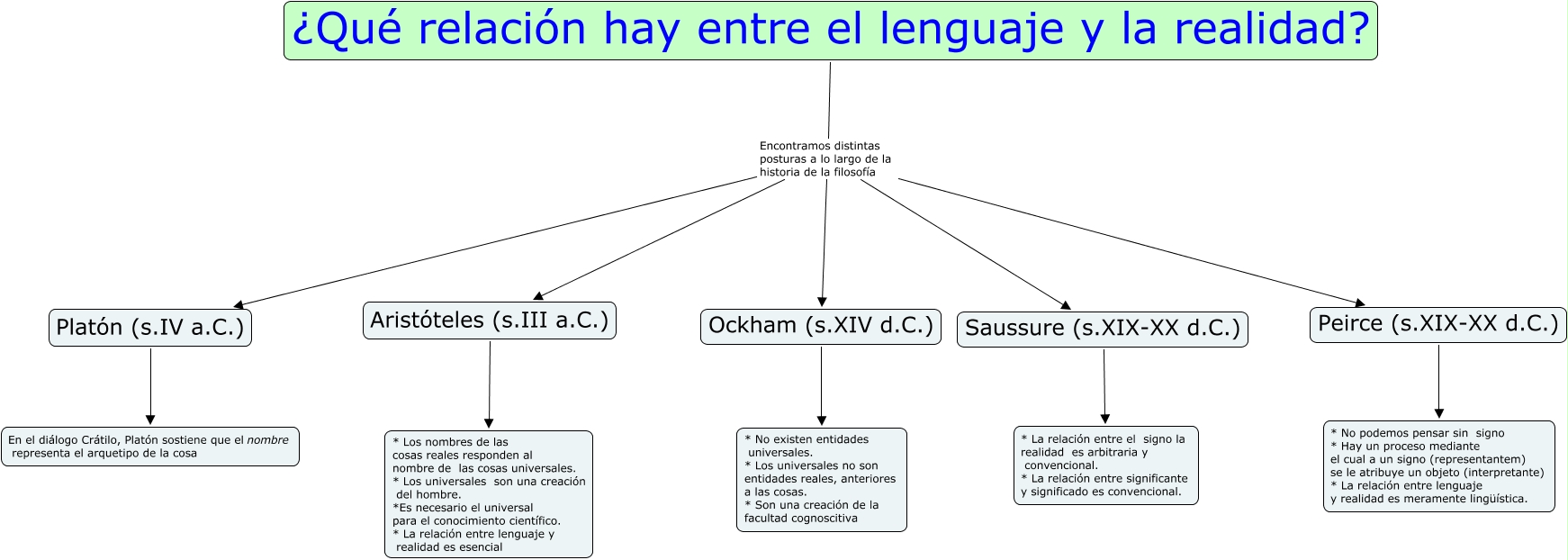 Este Cmap, tiene información relacionada con: Lenguaje y Realidad, ¿Qué relación hay entre el lenguaje y la realidad? Encontramos distintas posturas a lo largo de la historia de la filosofía Saussure (s.XIX-XX d.C.), Saussure (s.XIX-XX d.C.) * La relación entre el signo la realidad es arbitraria y convencional. * La relación entre significante y significado es convencional., Platón (s.IV a.C.) En el diálogo Crátilo, Platón sostiene que el nombre representa el arquetipo de la cosa, Aristóteles (s.III a.C.) * Los nombres de las cosas reales responden al nombre de las cosas universales. * Los universales son una creación del hombre. *Es necesario el universal para el conocimiento científico. * La relación entre lenguaje y realidad es esencial, ¿Qué relación hay entre el lenguaje y la realidad? Encontramos distintas posturas a lo largo de la historia de la filosofía Peirce (s.XIX-XX d.C.), ¿Qué relación hay entre el lenguaje y la realidad? Encontramos distintas posturas a lo largo de la historia de la filosofía Aristóteles (s.III a.C.), ¿Qué relación hay entre el lenguaje y la realidad? Encontramos distintas posturas a lo largo de la historia de la filosofía Ockham (s.XIV d.C.), Peirce (s.XIX-XX d.C.) * No podemos pensar sin signo * Hay un proceso mediante el cual a un signo (representantem) se le atribuye un objeto (interpretante) * La relación entre lenguaje y realidad es meramente lingüística., Ockham (s.XIV d.C.) * No existen entidades universales. * Los universales no son entidades reales, anteriores a las cosas. * Son una creación de la facultad cognoscitiva, ¿Qué relación hay entre el lenguaje y la realidad? Encontramos distintas posturas a lo largo de la historia de la filosofía Platón (s.IV a.C.)