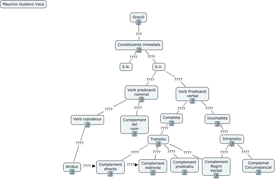 Aquest mapa conceptual conté informació relacionada amb: Sintaxi, Transitiu ???? Complement Regim Verbal, Intransitiu ???? Complemet Circumstancial, Constituients inmediats ???? S.V., Completa ???? Transitiu, Verb Predicació verbal ???? Incompleta, S.V. ???? Verb Predicació verbal, Incompleta ???? Intransitiu, Verb copulatius ???? Atribut, Oració ??? Constituients inmediats, Atribut ???? Complement directe, Transitiu ???? Complement directe, Verb predicació nominal ???? Complement del nom, S.V. ???? Verb predicació nominal, Transitiu ???? Complement indirecte, Verb predicació nominal ???? Verb copulatius, Intransitiu ???? Complement Regim Verbal, Transitiu ???? Complement predicatiu, Constituients inmediats ???? S.N., Verb Predicació verbal ???? Completa, Complement directe ???? Complement indirecte