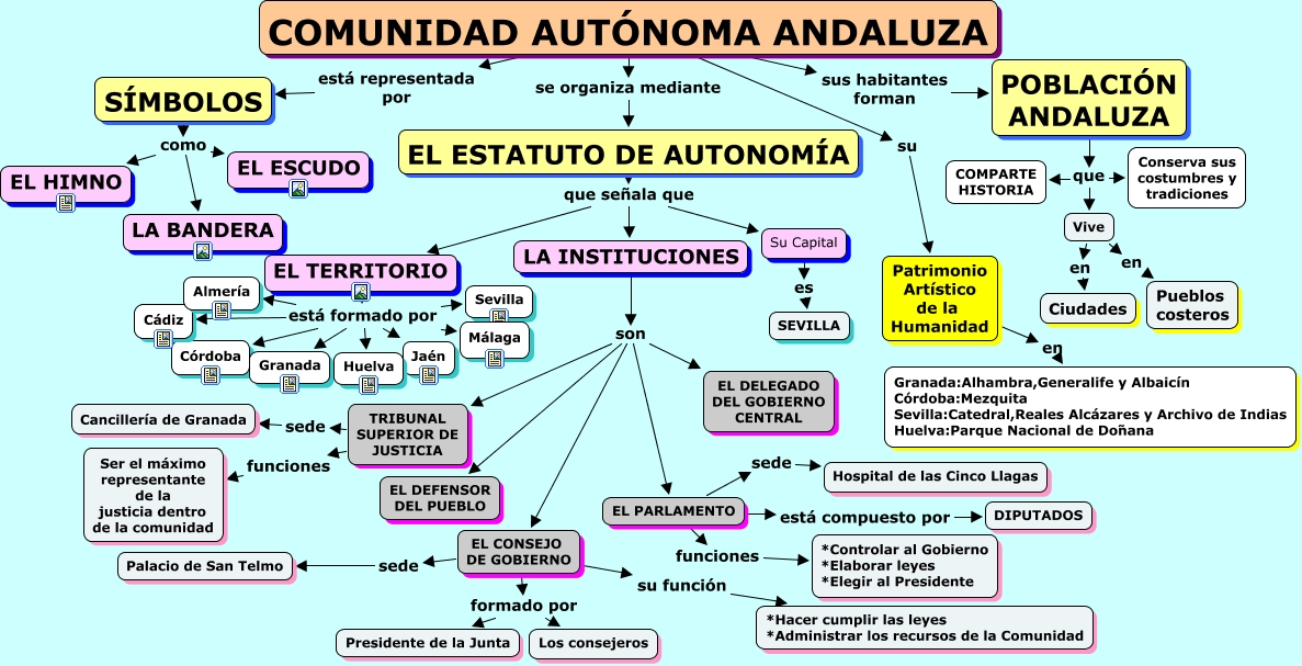 Este Cmap, tiene información relacionada con: Comunidad Autónoma Andaluza, SÍMBOLOS como EL HIMNO, EL CONSEJO DE GOBIERNO formado por Los consejeros, SÍMBOLOS como EL ESCUDO, POBLACIÓN ANDALUZA que Conserva sus costumbres y tradiciones, EL CONSEJO DE GOBIERNO su función *Hacer cumplir las leyes *Administrar los recursos de la Comunidad, EL CONSEJO DE GOBIERNO sede Palacio de San Telmo, EL CONSEJO DE GOBIERNO formado por Presidente de la Junta, EL TERRITORIO está formado por Granada, LA INSTITUCIONES son EL DELEGADO DEL GOBIERNO CENTRAL, TRIBUNAL SUPERIOR DE JUSTICIA sede Cancillería de Granada, EL TERRITORIO está formado por Sevilla, EL TERRITORIO está formado por Córdoba, POBLACIÓN ANDALUZA que COMPARTE HISTORIA, EL PARLAMENTO funciones *Controlar al Gobierno *Elaborar leyes *Elegir al Presidente, EL ESTATUTO DE AUTONOMÍA que señala que Su Capital, EL ESTATUTO DE AUTONOMÍA que señala que LA INSTITUCIONES, Vive en Ciudades, SÍMBOLOS como LA BANDERA, COMUNIDAD AUTÓNOMA ANDALUZA su Patrimonio Artístico de la Humanidad, Patrimonio Artístico de la Humanidad en Granada:Alhambra,Generalife y Albaicín Córdoba:Mezquita Sevilla:Catedral,Reales Alcázares y Archivo de Indias Huelva:Parque Nacional de Doñana