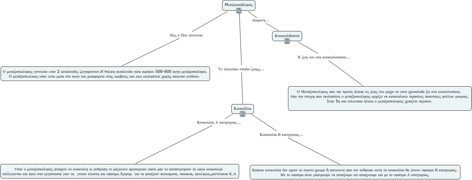 Αυτ�?ς ο εννοιολογικ�?ς χά�?της, που δημιου�?γήθηκε με το IHMC Cmap Tools, πε�?ιέχει πλή�?οφο�?ίες που σχετίζονται με: Απο την Ελενη Γ. π�?ος το Σουφλι, Mεταξοσκ�?ληκας Διαμονη... �?ουκουλ�?σπιτα, Mεταξοσκ�?ληκας Πως κ Που γεννιεται �? μεταξοσκοληκας γεννιεται οταν 2 πεταλουδες ζευγα�?ονουν.Η θυλικη πεταλουδα γενα πε�?ιπου 500-600 αυγα μεταξοσκοληκα. �? μεταξοσκωλικας οταν ειναι μεσα στο αυγο του μεταφε�?ετε στης κ�?εβατες και εκει εκολαπτετε χω�?ης κανεναν κινδυνο., Mεταξοσκ�?ληκας Το τελευταιο σταδιο ζωηςς... �?ουκο�?λια, �?ουκουλ�?σπιτα Η ζωη του στα κουκουλοσπιτα... �? �?εταξοσκοληκας απο την π�?ωτη ηλικια τις ζωης του μεχ�?ι να γινει χ�?υσαλιδα ζει στα κουκυλοσπιτα. Απο την στιγμη που εκολαπτετε ο μεταξοσκοληκας α�?χιζει να καταναλονει τε�?αστιες ποσοτητες φυλλων μου�?ιας. Στην 5η και τελευταια ηλικια ο μεταξοσκοληκας χ�?ιαζετε πε�?ιπου., �?ουκο�?λια �?ουκουλια Α κατηγο�?ιας .. �?ταν ο μεταξοσκοληκας φτιαχνει το κουκουλη οι ανθ�?ωπη το μαζευουν π�?οσεχτικα γιανα μην το καταστ�?ε�?ουν τα καλα κουκουλια συλλεγονται και πανε στα ε�?γοστασια γιαν να γινουν κλοστη και υφασμα.Χ�?ησιμ. για να φτιαξουν πουκαμισα, σακακια, φουλα�?ια,μαντιλακια �?.Α, �?ουκο�?λια �?ουκουλια Β κατηγο�?ιας... �?αποια κουκουλια δεν εχουν το σωστο χ�?ωμα ή πατιουντε απο τον ανθ�?ωπο αυτα τα κουκουλια θα γινουν υφασμα Β κατηγο�?ιας. �?ε το υφασμα αυτο μπου�?ουμε να φτιαξουμε οτι φτιαχνουμε και με το υφασμα Α κατηγο�?ιας.