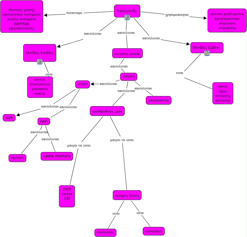 Αυτός ο εννοιολογικός χάρτης, που δημιουργήθηκε με το IHMC Cmap Tools, περιέχει πλήροφορίες που σχετίζονται με: panos pennas, Μονάδες Εξόδου ειναι οθονη ηχειο εκτυπωτης ακουστικα, ram αποτελειται cashe memory, αποθηκεθτικα μεσα μπορει να ειναι DVD κασετα CD, αποθηκεθτικα μεσα μπορει να ειναι σκληρος δισκος, Υπολογιστής αποτελειται Μονάδες Εισόδου, μητρικη αποτελειται αποθηκεθτικα μεσα, Υπολογιστής συνανταμε ιδιωτικης χρησης υπολογιστικα συστηματα μεγαλα συστηματα palmtop υπερυπολογιστες, Υπολογιστής αποτελειται Μονάδες Εξόδου, μνημη αποτελειται ram, Μονάδες Εισόδου ειναι ποντικι πληκτρολογιο μικροφωνο σκανερ, Υπολογιστής χρησιμοποιηται επιλυση προβληματων προγραμματισμο ψυχαγωγια ενημερωση, κεντρικη μοναδα αποτελειται μητρικη, μητρικη αποτελειται επεξεργαστης, σκληρος δισκος ειναι εξωτερικος, Υπολογιστής αποτελειται κεντρικη μοναδα, ram αποτελειται εικονικη, σκληρος δισκος ειναι εσωτερικος, μνημη αποτελειται rom, μητρικη αποτελειται μνημη