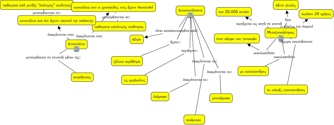 Αυτός ο εννοιολογικός χάρτης, που δημιουργήθηκε με το IHMC Cmap Tools, περιέχει πλήροφορίες που σχετίζονται με: μετάξι284, Mεταξοσκώληκας έχει πέντε ηλικίες, Κουκούλια διακρίνονται στα: κουκούλια που δεν έχουν υποστεί την απόπνιξη, Mεταξοσκώληκας σήμερα εκκολάπτεται σε ειδικές εγκαταστάσεις, Κουκουλόσπιτα διακρίνονται σε: τριώροφα, Mεταξοσκώληκας εκκολαπτόταν στον κόρφο των γυναικών, Κουκούλια μετατρέπεται σε κλωστή μέσω της: αναπήνισης, κουκούλια που δεν έχουν υποστεί την απόπνιξη μετατρέπονται σε: υφάσματα από μετάξι "δεύτερης" ποιότητας, κουκούλια που οι χρυσαλίδες τους έχουν θανατωθεί μετατρέπονται σε: υφάσματα καλύτερης ποιότητας, Κουκούλια διακρίνονται στα: κουκούλια που οι χρυσαλίδες τους έχουν θανατωθεί, Mεταξοσκώληκας εκκολαπτόταν με εκκολαπτήρες, Κουκουλόσπιτα διακρίνονται σε: διώροφα, Κουκουλόσπιτα έχουν: ξύλινα παράθυρα, Κουκουλόσπιτα περιέχουν: τις κρεβατίνες, Κουκουλόσπιτα είναι κατασκευασμένα από: πέτρα, Mεταξοσκώληκας περιέχεται ως αυγό σε κουτιά των 20.000 αυγών, Κουκουλόσπιτα διακρίνονται σε: μονοώροφα, Mεταξοσκώληκας ο κύκλος του διαρκεί περίπου 29 ημέρες
