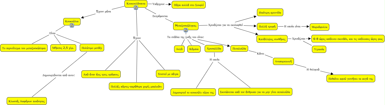 Αυτός ο εννοιολογικός χάρτης, που δημιουργήθηκε με το IHMC Cmap Tools, περιέχει πλήροφορίες που σχετίζονται με: Μεταξι Ανάλυση, Κουκούλια Είναι Το περυτίλιγμα του μεταξοσκώληκα, Mεταξοσκώληκας Τα στάδια της ζωής του είναι: Χρυσαλλίδα, Mεταξοσκώληκας Τα στάδια της ζωής του είναι: Κάμπια, Κουκουλόσπιτα Εκτρέφονται Mεταξοσκώληκας, Κουκουλόσπιτα Έχουν Χτιστεί με πέτρα, Αναπαραγωγή Η θυληκιά Πεθαίνει αφού γεννήσει τα αυγά της, Πολύτιμο μετάξι Δημιουργόυνται από αυτο: Κλωστές διαφόρων ποιότητας, Κουκουλόσπιτα Έχουν Από έναν έως τρεις ορόφους, Πολλή τροφή Η οποία είναι Μορεόφυλλα, Κουκουλόσπιτα Έχουν μέσα Κουκούλια, Mεταξοσκώληκας Χρειάζεται για να εκολαφθεί Κατάλληλες συνθήκες, Κουκούλια Είναι Πολύτιμο μετάξι, Πεταλούδα Κάνει Αναπαραγωγή, Κουκουλόσπιτα Έχουν Πολλές πόρτες-παράθυρα χωρίς μπαλκόνι, Χρυσαλλίδα Η οποία Δημιουργεί το κουκούλι γύρω της, Κατάλληλες συνθήκες Χρειάζεται 6-8 ώρες απόλυτο σκοτάδι, και τις υπόλοιπες ώρες φως, Κατάλληλες συνθήκες Χρειάζεται Υγρασία, Mεταξοσκώληκας Χρειάζεται για να εκολαφθεί Ιδιαίτερη φροντίδα, Κουκούλια Είναι Μήκους 2,5 χλμ., Κουκουλόσπιτα Υπάρχουν Πάρα πολλά στο Σουφλί