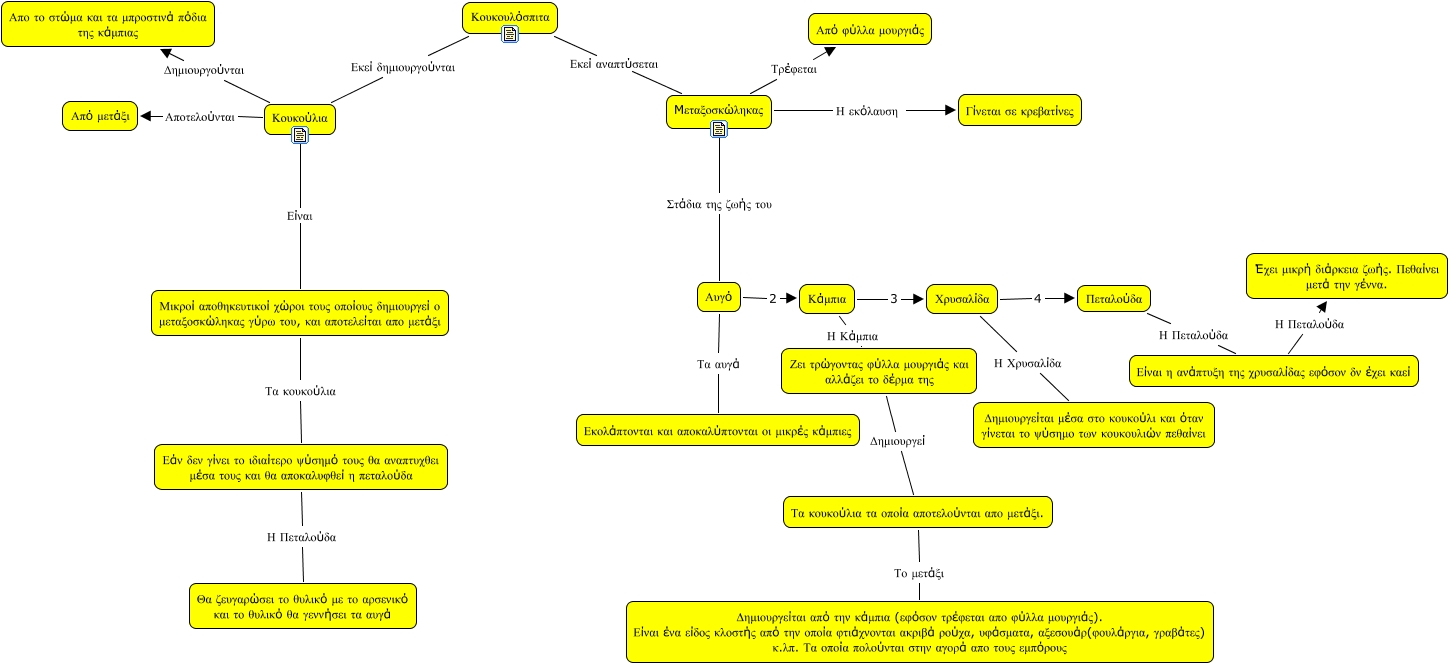 Αυτός ο εννοιολογικός χάρτης, που δημιουργήθηκε με το IHMC Cmap Tools, περιέχει πλήροφορίες που σχετίζονται με: Πληροφορίες για το μετάξι, Κουκούλια Είναι Μικροί αποθηκευτικοί χώροι τους οποίους δημιουργεί ο μεταξοσκώληκας γύρω του, και αποτελείται απο μετάξι, Mεταξοσκώληκας Τρέφεται Από φύλλα μουργιάς, Τα κουκούλια τα οποία αποτελούνται απο μετάξι. Το μετάξι Δημιουργείται από την κάμπια (εφόσον τρέφεται απο φύλλα μουργιάς). Είναι ένα είδος κλοστής από την οποία φτιάχνονται ακριβά ρούχα, υφάσματα, αξεσουάρ(φουλάργια, γραβάτες) κ.λπ. Τα οποία πολούνται στην αγορά απο τους εμπόρους, Πεταλούδα Η Πεταλούδα Είναι η ανάπτυξη της χρυσαλίδας εφόσον δν έχει καεί, Χρυσαλίδα 4 Πεταλούδα, Χρυσαλίδα Η Χρυσαλίδα Δημιουργείται μέσα στο κουκούλι και όταν γίνεται το ψύσημο των κουκουλιών πεθαίνει, Mεταξοσκώληκας Στάδια της ζωής του Αυγό, Mεταξοσκώληκας Η εκόλαυση Γίνεται σε κρεβατίνες, Αυγό Τα αυγά Εκολάπτονται και αποκαλύπτονται οι μικρές κάμπιες, Κουκουλόσπιτα Εκεί αναπτύσεται Mεταξοσκώληκας, Κάμπια 3 Χρυσαλίδα, Είναι η ανάπτυξη της χρυσαλίδας εφόσον δν έχει καεί Η Πεταλούδα Έχει μικρή διάρκεια ζωής. Πεθαίνει μετά την γέννα., Κουκουλόσπιτα Εκεί δημιουργούνται Κουκούλια, Εάν δεν γίνει το ιδιαίτερο ψύσημό τους θα αναπτυχθει μέσα τους και θα αποκαλυφθεί η πεταλούδα Η Πεταλούδα Θα ζευγαρώσει το θυλικό με το αρσενικό και το θυλικό θα γεννήσει τα αυγά, Κουκούλια Δημιουργούνται Απο το στώμα και τα μπροστινά πόδια της κάμπιας, Μικροί αποθηκευτικοί χώροι τους οποίους δημιουργεί ο μεταξοσκώληκας γύρω του, και αποτελείται απο μετάξι Τα κουκούλια Εάν δεν γίνει το ιδιαίτερο ψύσημό τους θα αναπτυχθει μέσα τους και θα αποκαλυφθεί η πεταλούδα, Αυγό 2 Κάμπια, Κάμπια Η Κάμπια Ζει τρώγοντας φύλλα μουργιάς και αλλάζει το δέρμα της, Κουκούλια Αποτελούνται Από μετάξι, Ζει τρώγοντας φύλλα μουργιάς και αλλάζει το δέρμα της Δημιουργεί Τα κουκούλια τα οποία αποτελούνται απο μετάξι.