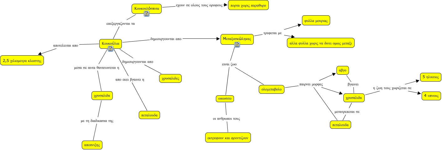 Αυτός ο εννοιολογικός χάρτης, που δημιουργήθηκε με το IHMC Cmap Tools, περιέχει πλήροφορίες που σχετίζονται με: εργασια για μεταξοσκωληκα, χρυσαλιδα η ζωη τους χωριζεται σε 5 ηλικειες, Mεταξοσκώληκας ειναι ζωο ολομεταβολο, Κουκούλια απο εκει βγαινει η πεταλουδα, Κουκούλια μεσα σε αυτα θανατωνεται η χρυσαλιδα, χρυσαλιδα με τη διαδικασια της αποπνιξης, Κουκούλια δημιουργουνται απο Mεταξοσκώληκας, Mεταξοσκώληκας ειναι ζωο οικοσιτο, Κουκουλόσπιτα εχουν σε ολους τους οροφους πορτα χωρις παραθυρο, χρυσαλιδα η ζωη τους χωριζεται σε 4 υπνους, ολομεταβολο παιρνει μορφες χρυσαλιδα, Mεταξοσκώληκας τρεφεται με αλλα φυλλα χωρις να δινει ομως μεταξι, Mεταξοσκώληκας τρεφεται με φυλλα μουριας, ολομεταβολο παιρνει μορφες πεταλουδα, οικοσιτο οι ανθρωποι τους εκτρεφουν και φροντιζουν, ολομεταβολο παιρνει μορφες αβγο, Κουκούλια αποτελειται απο 2,5 χιλιομετρα κλωστης, Κουκουλόσπιτα επεξεργαζονται τα Κουκούλια, Κουκούλια δημιουργουνται απο χρυσαλιδες, αβγο βγαινει χρυσαλιδα, χρυσαλιδα μετατρεπεται σε πεταλουδα