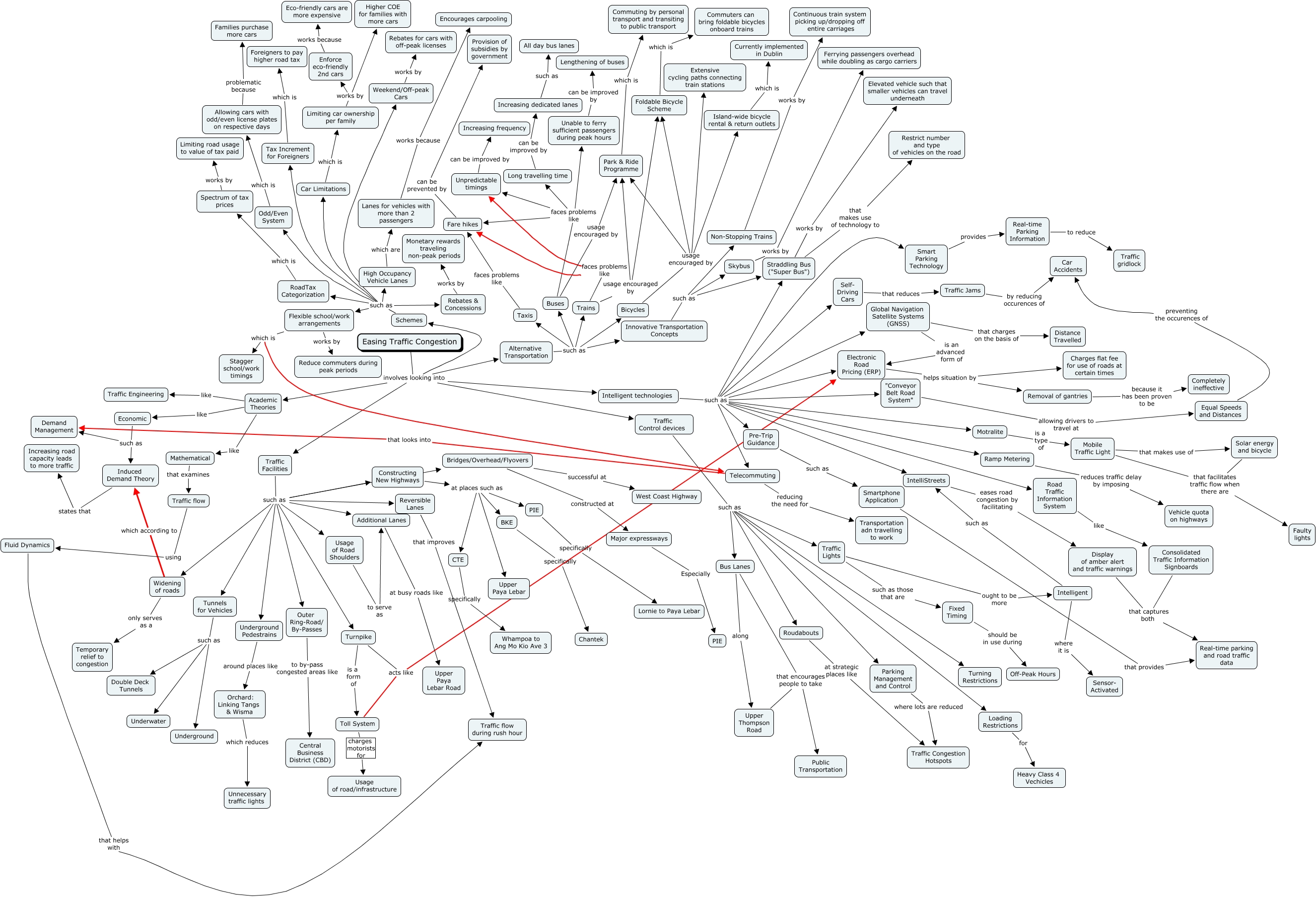 This Concept Map, created with IHMC CmapTools, has information related to: haha, Alternative Transportation such as Trains, Schemes such as Weekend/Off-peak Cars, Alternative Transportation such as Buses, Solar energy and bicycle that facilitates traffic flow when there are Faulty lights, Traffic Facilities such as Underground Pedestrains, Smartphone Application that provides Real-time parking and road traffic data, Buses usage encouraged by Park & Ride Programme, Traffic Facilities such as Usage of Road Shoulders, Intelligent such as IntelliStreets, Car Limitations which is Limiting car ownership per family, Unable to ferry sufficient passengers during peak hours can be improved by Lengthening of buses, Induced Demand Theory states that Increasing road capacity leads to more traffic, Loading Restrictions for Heavy Class 4 Vechicles, Buses faces problems like Unable to ferry sufficient passengers during peak hours, Buses faces problems like Unpredictable timings, Roudabouts at strategic places like Traffic Congestion Hotspots, Straddling Bus ("Super Bus") works by Elevated vehicle such that smaller vehicles can travel underneath, Easing Traffic Congestion involves looking into Academic Theories, Innovative Transportation Concepts such as Skybus, Telecommuting that looks into Demand Management