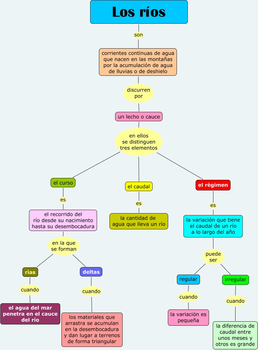 Este Cmap, tiene información relacionada con: Los ríos, un lecho o cauce en ellos se distinguen tres elementos el régimen, el curso es el recorrido del río desde su nacimiento hasta su desembocadura, Los ríos son corrientes continuas de agua que nacen en las montañas por la acumulación de agua de lluvias o de deshielo, rías cuando el agua del mar penetra en el cauce del río, deltas cuando los materiales que arrastra se acumulan en la desembocadura y dan lugar a terrenos de forma triangular, la variación que tiene el caudal de un río a lo largo del año puede ser regular, regular cuando la variación es pequeña, el régimen es la variación que tiene el caudal de un río a lo largo del año, el recorrido del río desde su nacimiento hasta su desembocadura en la que se forman rías, el recorrido del río desde su nacimiento hasta su desembocadura en la que se forman deltas, la variación que tiene el caudal de un río a lo largo del año puede ser irregular, un lecho o cauce en ellos se distinguen tres elementos el caudal, el caudal es la cantidad de agua que lleva un río, corrientes continuas de agua que nacen en las montañas por la acumulación de agua de lluvias o de deshielo discurren por un lecho o cauce, irregular cuando la diferencia de caudal entre unos meses y otros es grande, un lecho o cauce en ellos se distinguen tres elementos el curso