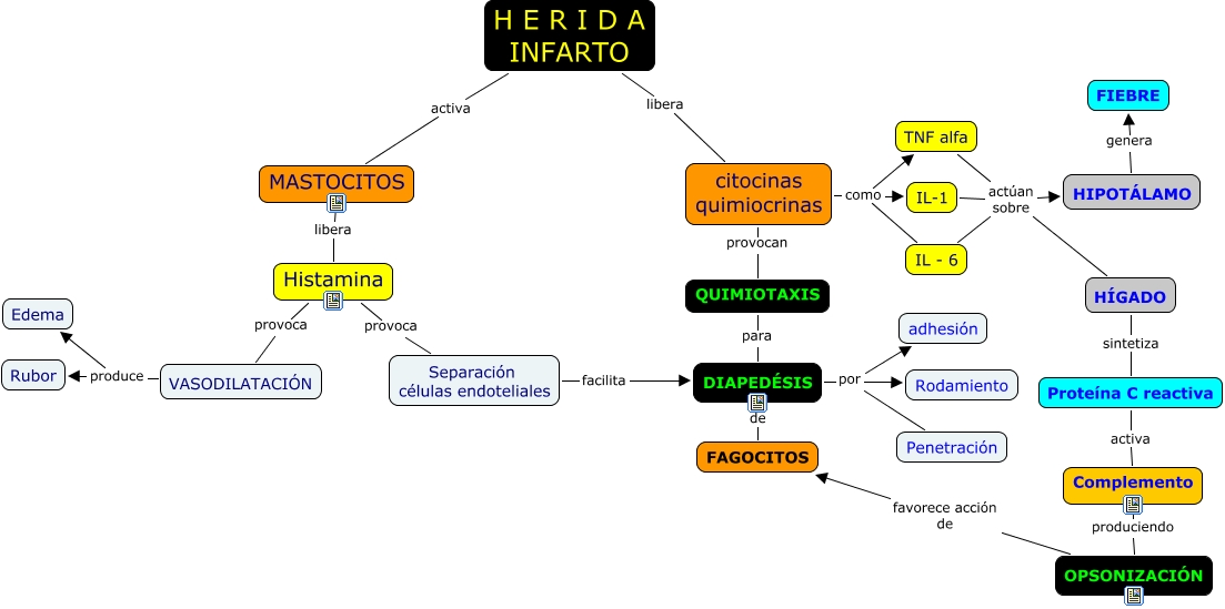 Este Cmap, tiene información relacionada con: RESPUESTA INFLAMATORIA, DIAPEDÉSIS de FAGOCITOS, DIAPEDÉSIS por Penetración, H E R I D A INFARTO activa MASTOCITOS, IL - 6 actúan sobre HÍGADO, VASODILATACIÓN produce Rubor, Histamina provoca Separación células endoteliales, MASTOCITOS libera Histamina, VASODILATACIÓN produce Edema, HIPOTÁLAMO genera FIEBRE, IL - 6 actúan sobre HIPOTÁLAMO, H E R I D A INFARTO libera citocinas quimiocrinas, IL-1 actúan sobre HIPOTÁLAMO, citocinas quimiocrinas como TNF alfa, DIAPEDÉSIS por adhesión, IL-1 actúan sobre HÍGADO, TNF alfa actúan sobre HÍGADO, QUIMIOTAXIS para DIAPEDÉSIS, TNF alfa actúan sobre HIPOTÁLAMO, Complemento produciendo OPSONIZACIÓN, HÍGADO sintetiza Proteína C reactiva
