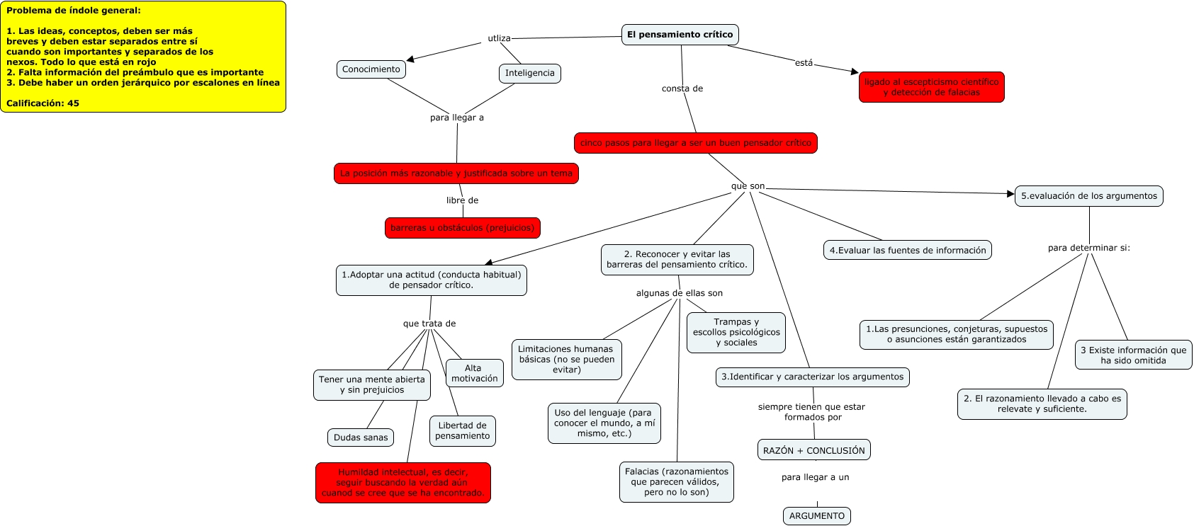 Este Cmap, tiene información relacionada con: C2_Pensamiento crítico, 2. Reconocer y evitar las barreras del pensamiento crítico. algunas de ellas son Falacias (razonamientos que parecen válidos, pero no lo son), 2. Reconocer y evitar las barreras del pensamiento crítico. algunas de ellas son Uso del lenguaje (para conocer el mundo, a mí mismo, etc.), 5.evaluación de los argumentos para determinar si: 3 Existe información que ha sido omitida, El pensamiento crítico está ligado al escepticismo científico y detección de falacias, 2. Reconocer y evitar las barreras del pensamiento crítico. algunas de ellas son Trampas y escollos psicológicos y sociales, RAZÓN + CONCLUSIÓN para llegar a un ARGUMENTO, 1.Adoptar una actitud (conducta habitual) de pensador crítico. que trata de Libertad de pensamiento, Conocimiento para llegar a La posición más razonable y justificada sobre un tema, cinco pasos para llegar a ser un buen pensador crítico que son 3.Identificar y caracterizar los argumentos, cinco pasos para llegar a ser un buen pensador crítico que son 5.evaluación de los argumentos, Inteligencia para llegar a La posición más razonable y justificada sobre un tema, El pensamiento crítico utliza Inteligencia, 1.Adoptar una actitud (conducta habitual) de pensador crítico. que trata de Alta motivación, 5.evaluación de los argumentos para determinar si: 1.Las presunciones, conjeturas, supuestos o asunciones están garantizados, 1.Adoptar una actitud (conducta habitual) de pensador crítico. que trata de Tener una mente abierta y sin prejuicios, 3.Identificar y caracterizar los argumentos siempre tienen que estar formados por RAZÓN + CONCLUSIÓN, El pensamiento crítico utliza Conocimiento, cinco pasos para llegar a ser un buen pensador crítico que son 4.Evaluar las fuentes de información, cinco pasos para llegar a ser un buen pensador crítico que son 1.Adoptar una actitud (conducta habitual) de pensador crítico., La posición más razonable y justificada sobre un tema libre de barreras u obstáculos (prejuicios)