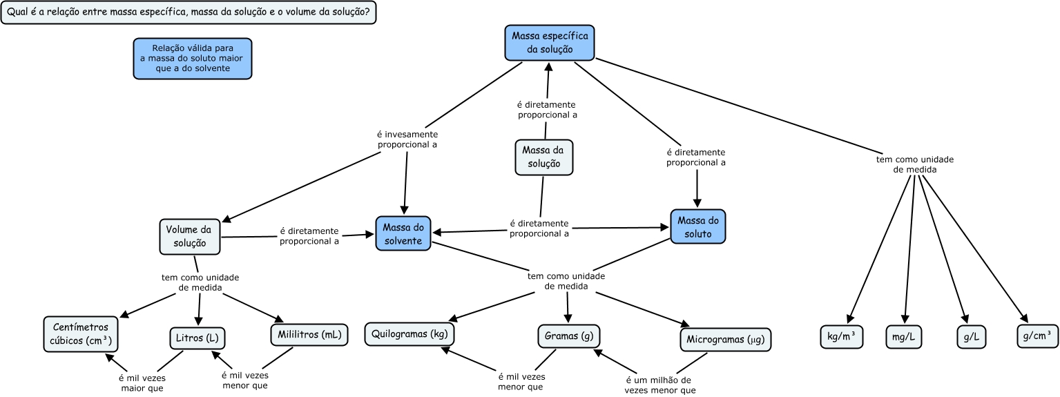 Esse mapa conceitual, produzido no IHMC CmapTools, tem a informação relacionada a: Massa específica 2B, Mililitros (mL) é mil vezes menor que Litros (L), Microgramas (μg) é um milhão de vezes menor que Gramas (g), Massa da solução é diretamente proporcional a Massa do solvente, Volume da solução é diretamente proporcional a Massa do solvente, Massa específica da solução é invesamente proporcional a Volume da solução, Massa da solução é diretamente proporcional a Massa específica da solução, Massa específica da solução tem como unidade de medida g/L, Litros (L) é mil vezes maior que Centímetros cúbicos (cm³), Volume da solução tem como unidade de medida Centímetros cúbicos (cm³), Massa do solvente tem como unidade de medida Quilogramas (kg), Massa do solvente tem como unidade de medida Microgramas (μg), Massa do solvente tem como unidade de medida Gramas (g), Massa do soluto tem como unidade de medida Microgramas (μg), Massa da solução é diretamente proporcional a Massa do soluto, Massa específica da solução tem como unidade de medida g/cm³, Massa específica da solução tem como unidade de medida kg/m³, Massa específica da solução tem como unidade de medida mg/L, Gramas (g) é mil vezes menor que Quilogramas (kg), Volume da solução tem como unidade de medida Mililitros (mL), Volume da solução tem como unidade de medida Litros (L)