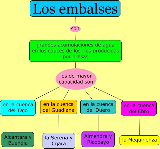 Este Cmap, tiene información relacionada con: Los embalses, grandes acumulaciones de agua en los cauces de los ríos producidas por presas los de mayor capacidad son en la cuenca del Duero, grandes acumulaciones de agua en los cauces de los ríos producidas por presas los de mayor capacidad son en la cuenca del Ebro, en la cuenca del Guadiana la Serena y Cíjara, grandes acumulaciones de agua en los cauces de los ríos producidas por presas los de mayor capacidad son en la cuenca del Guadiana, Los embalses son grandes acumulaciones de agua en los cauces de los ríos producidas por presas, en la cuenca del Duero Almendra y Ricobayo, en la cuenca del Ebro la Mequinenza, grandes acumulaciones de agua en los cauces de los ríos producidas por presas los de mayor capacidad son en la cuenca del Tajo, en la cuenca del Tajo Alcántara y Buendía