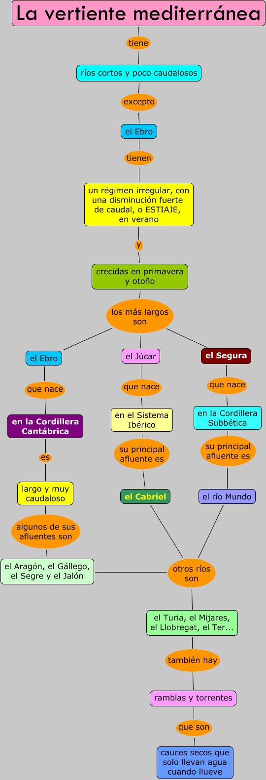 Este Cmap, tiene información relacionada con: La vertiente mediterránea, largo y muy caudaloso algunos de sus afluentes son el Aragón, el Gállego, el Segre y el Jalón, en la Cordillera Cantábrica es largo y muy caudaloso, ríos cortos y poco caudalosos excepto el Ebro, el Segura que nace en la Cordillera Subbética, el río Mundo otros ríos son el Turia, el Mijares, el Llobregat, el Ter..., ramblas y torrentes que son cauces secos que solo llevan agua cuando llueve, el Turia, el Mijares, el Llobregat, el Ter... también hay ramblas y torrentes, el Ebro que nace en la Cordillera Cantábrica, un régimen irregular, con una disminución fuerte de caudal, o ESTIAJE, en verano y crecidas en primavera y otoño, crecidas en primavera y otoño los más largos son el Júcar, el Cabriel otros ríos son el Turia, el Mijares, el Llobregat, el Ter..., crecidas en primavera y otoño los más largos son el Ebro, crecidas en primavera y otoño los más largos son el Segura, el Ebro tienen un régimen irregular, con una disminución fuerte de caudal, o ESTIAJE, en verano, en la Cordillera Subbética su principal afluente es el río Mundo, el Júcar que nace en el Sistema Ibérico, en el Sistema Ibérico su principal afluente es el Cabriel, La vertiente mediterránea tiene ríos cortos y poco caudalosos, el Aragón, el Gállego, el Segre y el Jalón otros ríos son el Turia, el Mijares, el Llobregat, el Ter...