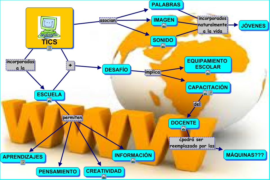 Este Cmap, tiene información relacionada con: MODOS DE TRABAJO EN LA ESCUELA, TICS + DESAFÍO, ESCUELA permiten CREATIVIDAD, DESAFÍO implica CAPACITACIÓN, PALABRAS incorporados naturalmente a la vida JÓVENES, DOCENTE ¿podrá ser reemplazado por las MÁQUINAS???, DESAFÍO implica EQUIPAMIENTO ESCOLAR, ESCUELA permiten INFORMACIÓN, CAPACITACIÓN del DOCENTE, ESCUELA permiten PENSAMIENTO, ESCUELA + DESAFÍO, SONIDO incorporados naturalmente a la vida JÓVENES, IMAGEN incorporados naturalmente a la vida JÓVENES, TICS asocian SONIDO, TICS asocian PALABRAS, ESCUELA permiten APRENDIZAJES, TICS asocian IMAGEN, TICS incorporadas a la ESCUELA