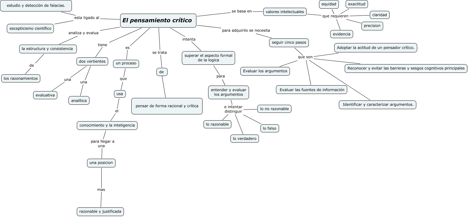 Este Cmap, tiene información relacionada con: Pensamiento crítico Elisa García Andrea Castor C5, El pensamiento crítico tiene dos vertientes, seguir cinco pasos que son Identificar y caracterizar argumentos., seguir cinco pasos que son Evaluar los argumentos, seguir cinco pasos que son Adoptar la actitud de un pensador crítico., entender y evaluar los argumentos e intentar distinguir lo verdadero, El pensamiento crítico se basa en valores intelectuales, entender y evaluar los argumentos e intentar distinguir lo no razonable, superar el aspecto formal de la logica para entender y evaluar los argumentos, El pensamiento crítico para adquirilo se necesita seguir cinco pasos, valores intelectuales que requieren evidencia, seguir cinco pasos que son Evaluar las fuentes de información, entender y evaluar los argumentos e intentar distinguir lo falso, dos vertientes una analítica, dos vertientes una evaluativa, una posicion mas razonable y justificada, El pensamiento crítico esta ligado al estudio y detección de falacias., de pensar de forma racional y crítica, un proceso que usa, El pensamiento crítico esta ligado al escepticismo científico, valores intelectuales que requieren precision