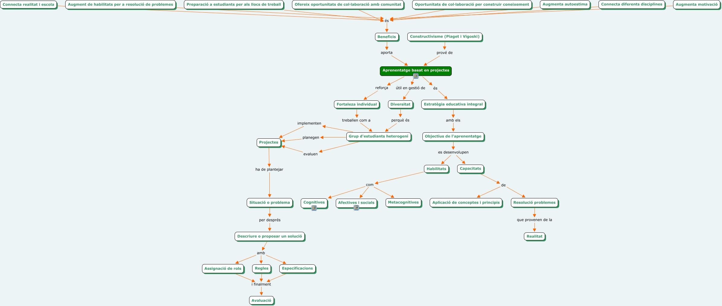 Este Cmap, tiene información relacionada con: ABProjectes, Regles i finalment Avaluació, Descriure o proposar un solució amb Regles, Constructivisme (Piaget i Vigoski) prové de Aprenentatge basat en projectes, Situació o problema per després Descriure o proposar un solució, Assignació de rols i finalment Avaluació, Projectes ha de plantejar Situació o problema, Habilitats com Cognitives, Aprenentatge basat en projectes útil en gestió de Diversitat, Fortaleza individual treballen com a Grup d'estudiants heterogeni, Beneficis aporta Aprenentatge basat en projectes, Grup d'estudiants heterogeni evaluen Projectes, Oportunitats de col·laboració per construir coneixement és Beneficis, Preparació a estudiants per als llocs de treball és Beneficis, Diversitat perquè és Grup d'estudiants heterogeni, Grup d'estudiants heterogeni implementen Projectes, Augmenta motivació és Beneficis, Estratègia educativa integral amb els Objectius de l'aprenentatge, Especificacions i finalment Avaluació, Habilitats com Afectives i socials, Aprenentatge basat en projectes reforça Fortaleza individual