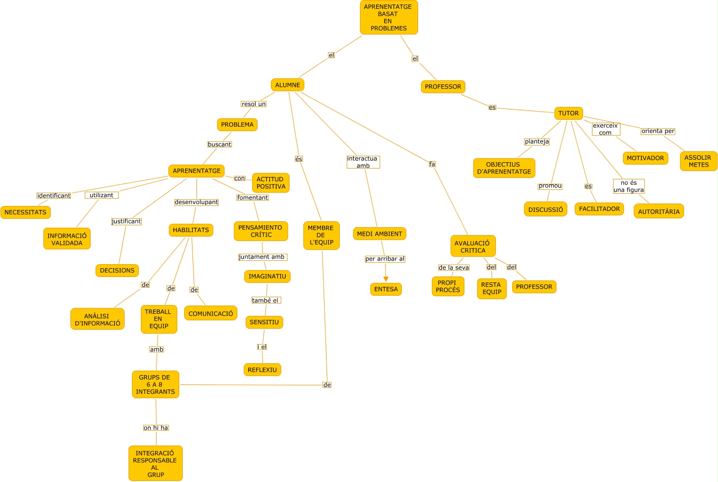 Este Cmap, tiene información relacionada con: Aprendizaje basado en problemas, TUTOR orienta per ASSOLIR METES, HABILITATS de ANÀLISI D'INFORMACIÓ, MEDI AMBIENT per arribar al ENTESA, PROFESSOR es TUTOR, PROBLEMA buscant APRENENTATGE, TUTOR planteja OBJECTIUS D'APRENENTATGE, AVALUACIÓ CRITICA del PROFESSOR, AVALUACIÓ CRITICA de la seva PROPI PROCÉS, SENSITIU i el REFLEXIU, APRENENTATGE BASAT EN PROBLEMES el ALUMNE, MEMBRE DE L'EQUIP de GRUPS DE 6 A 8 INTEGRANTS, ALUMNE interactua amb MEDI AMBIENT, AVALUACIÓ CRITICA del RESTA EQUIP, APRENENTATGE desenvolupant HABILITATS, PENSAMIENTO CRÍTIC juntament amb IMAGINATIU, APRENENTATGE fomentant PENSAMIENTO CRÍTIC, TUTOR es FACILITADOR, ALUMNE és MEMBRE DE L'EQUIP, APRENENTATGE justificant DECISIONS, HABILITATS de TREBALL EN EQUIP