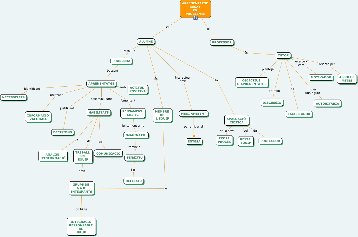 Este Cmap, tiene información relacionada con: Aprendizaje basado en problemas, TUTOR és FACILITADOR, IMAGINATIU també el SENSITIU, TUTOR promou DISCUSSIÓ, TREBALL EN EQUIP amb GRUPS DE 6 A 8 INTEGRANTS, AVALUACIÓ CRITICA del PROFESSOR, ALUMNE interactua amb MEDI AMBIENT, APRENENTATGE fomentant PENSAMENT CRÍTIC, ALUMNE resol un PROBLEMA, APRENENTATGE justificant DECISIONS, TUTOR orienta per ASSOLIR METES, HABILITATS de COMUNICACIÓ, ALUMNE fa AVALUACIÓ CRITICA, AVALUACIÓ CRITICA de la seva PROPI PROCÉS, HABILITATS de ANÀLISI D'INFORMACIÓ, APRENENTATGE desenvolupant HABILITATS, PROFESSOR és TUTOR, APRENENTATGE BASAT EN PROBLEMES el ALUMNE, GRUPS DE 6 A 8 INTEGRANTS on hi ha INTEGRACIÓ RESPONSABLE AL GRUP, TUTOR planteja OBJECTIUS D'APRENENTATGE, PENSAMENT CRÍTIC juntament amb IMAGINATIU