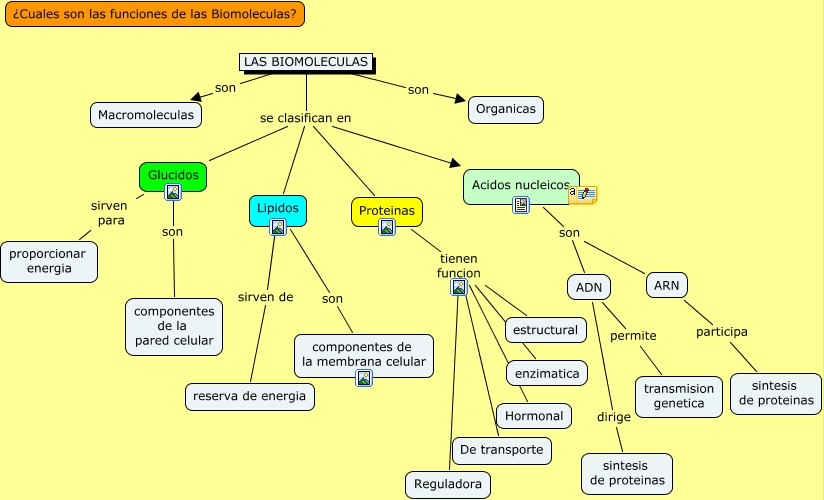 Este Cmap, tiene información relacionada con: Biomoleculas, LAS BIOMOLECULAS son Organicas, Lipidos sirven de reserva de energia, LAS BIOMOLECULAS se clasifican en Proteinas, Proteinas tienen funcion enzimatica, LAS BIOMOLECULAS son Macromoleculas, LAS BIOMOLECULAS se clasifican en Lipidos, Proteinas tienen funcion estructural, Glucidos son componentes de la pared celular, ARN participa sintesis de proteinas, Lipidos son componentes de la membrana celular, LAS BIOMOLECULAS se clasifican en Acidos nucleicos, Proteinas tienen funcion Reguladora, Acidos nucleicos son ARN, ADN dirige sintesis de proteinas, Glucidos sirven para proporcionar energia, Proteinas tienen funcion Hormonal, Acidos nucleicos son ADN, Proteinas tienen funcion De transporte, ADN permite transmision genetica, LAS BIOMOLECULAS se clasifican en Glucidos