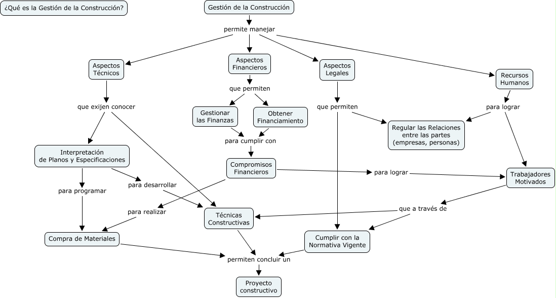 Este Cmap, tiene información relacionada con: Gest_Construcc, Recursos Humanos para lograr Trabajadores Motivados, Gestionar las Finanzas para cumplir con Compromisos Financieros, Aspectos Financieros que permiten Obtener Financiamiento, Aspectos Técnicos que exijen conocer Interpretación de Planos y Especificaciones, Gestión de la Construcción permite manejar Aspectos Técnicos, Aspectos Legales que permiten Cumplir con la Normativa Vigente, Compromisos Financieros para lograr Trabajadores Motivados, Aspectos Legales que permiten Regular las Relaciones entre las partes (empresas, personas), Trabajadores Motivados que a través de Técnicas Constructivas, Interpretación de Planos y Especificaciones para desarrollar Técnicas Constructivas, Obtener Financiamiento para cumplir con Compromisos Financieros, Gestión de la Construcción permite manejar Aspectos Financieros, Aspectos Técnicos que exijen conocer Técnicas Constructivas, Recursos Humanos para lograr Regular las Relaciones entre las partes (empresas, personas), Gestión de la Construcción permite manejar Aspectos Legales, Trabajadores Motivados que a través de Cumplir con la Normativa Vigente, Compromisos Financieros para realizar Compra de Materiales, Interpretación de Planos y Especificaciones para programar Compra de Materiales, Compra de Materiales permiten concluir un Proyecto constructivo, Aspectos Financieros que permiten Gestionar las Finanzas