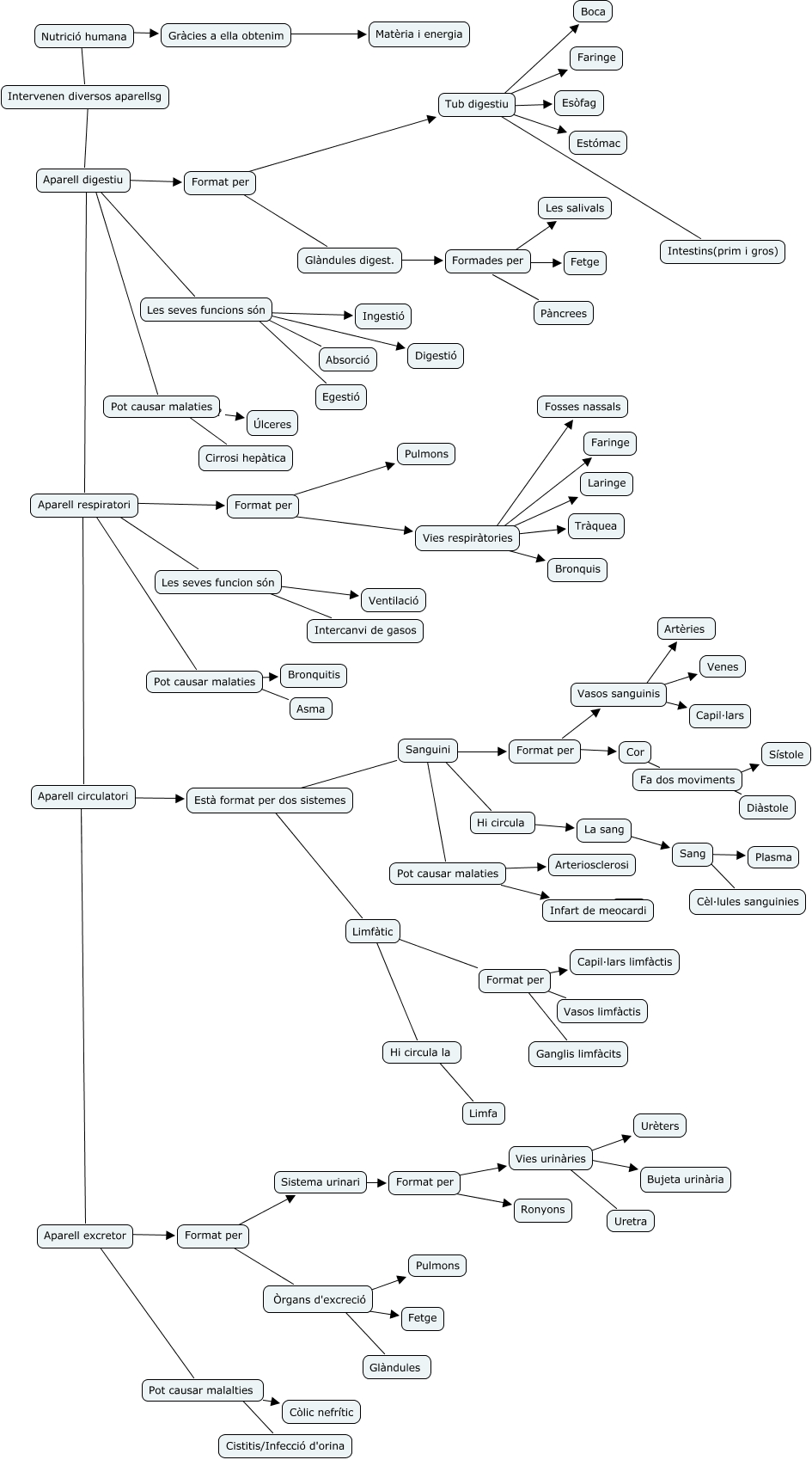 This Concept Map, created with IHMC CmapTools, has information related to: NUTRICIÓ HUMANA, Cor ???? Fa dos moviments, Les seves funcions són ???? Ingestió, Format per ???? Tub digestiu, Format per ???? Capil·lars limfàctis, Fa dos moviments ???? Sístole, Aparell digestiu ???? Aparell respiratori, Aparell circulatori ???? Aparell excretor, Aparell respiratori ???? Les seves funcion són, Formades per ???? Pàncrees, Aparell digestiu ???? Pot causar malaties, Les seves funcions són ???? Absorció, Pot causar malaties ???? Cirrosi hepàtica, Vies urinàries ???? Bujeta urinària, Aparell respiratori ???? Pot causar malaties, Tub digestiu ???? Intestins(prim i gros), Aparell circulatori ???? Està format per dos sistemes, Pot causar malaties ???? Bronquitis, Pot causar malalties ???? Còlic nefrític, Tub digestiu ???? Faringe, Vies respiràtories ???? Fosses nassals