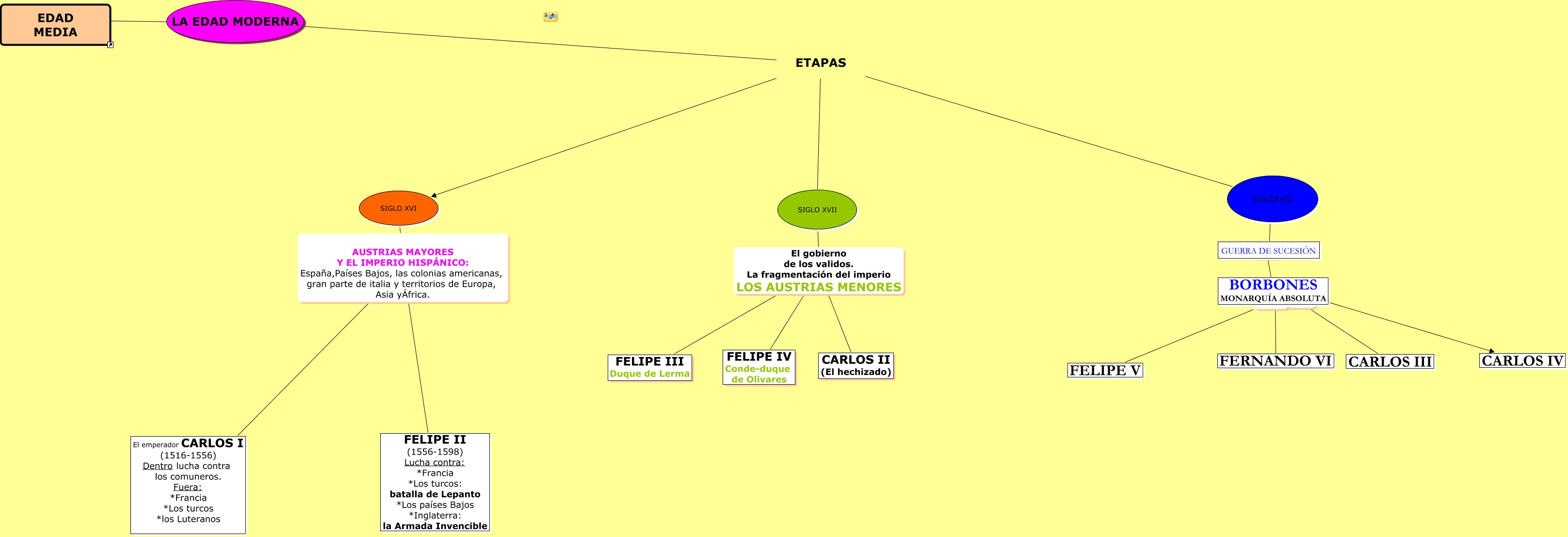 Este Cmap, tiene información relacionada con: E. MODERNA, SIGLO XVII El gobierno de los validos. La fragmentación del imperio LOS AUSTRIAS MENORES FELIPE III Duque de Lerma, BORBONES MONARQUÍA ABSOLUTA ???? FELIPE V, EDAD MEDIA ???? ????, BORBONES MONARQUÍA ABSOLUTA ???? CARLOS IV, LA EDAD MODERNA ETAPAS SIGLO XVI, SIGLOXVIII ???? GUERRA DE SUCESIÓN, BORBONES MONARQUÍA ABSOLUTA ???? CARLOS III, SIGLO XVI AUSTRIAS MAYORES Y EL IMPERIO HISPÁNICO: España,Países Bajos, las colonias americanas, gran parte de italia y territorios de Europa, Asia yÁfrica. El emperador CARLOS I (1516-1556) Dentro lucha contra los comuneros. Fuera: *Francia *Los turcos *los Luteranos, BORBONES MONARQUÍA ABSOLUTA ???? FERNANDO VI, SIGLO XVI AUSTRIAS MAYORES Y EL IMPERIO HISPÁNICO: España,Países Bajos, las colonias americanas, gran parte de italia y territorios de Europa, Asia yÁfrica. FELIPE II (1556-1598) Lucha contra: *Francia *Los turcos: batalla de Lepanto *Los países Bajos *Inglaterra: la Armada Invencible, LA EDAD MODERNA ETAPAS SIGLOXVIII, SIGLO XVII El gobierno de los validos. La fragmentación del imperio LOS AUSTRIAS MENORES CARLOS II (El hechizado), GUERRA DE SUCESIÓN ???? BORBONES MONARQUÍA ABSOLUTA, LA EDAD MODERNA ETAPAS SIGLO XVII, SIGLO XVII El gobierno de los validos. La fragmentación del imperio LOS AUSTRIAS MENORES FELIPE IV Conde-duque de Olivares