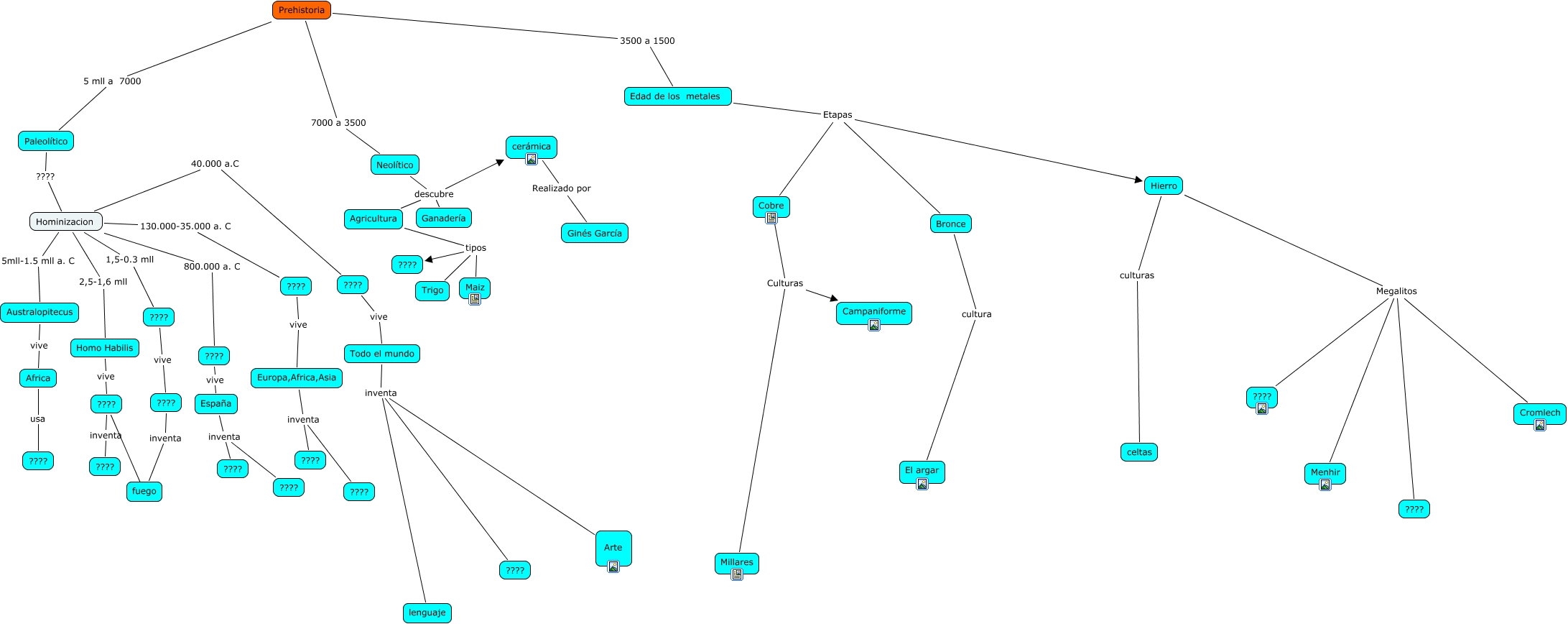 Este Cmap, tiene información relacionada con: Prehistoria, Neolítico descubre Agricultura, Todo el mundo inventa lenguaje, ???? vive Todo el mundo, Africa usa ????, Hierro Megalitos ????, Edad de los metales Etapas Cobre, Prehistoria 7000 a 3500 Neolítico, Agricultura tipos Trigo, Prehistoria 3500 a 1500 Edad de los metales, Todo el mundo inventa Arte, Homo Habilis vive ????, Hierro culturas celtas, Hominizacion 5mll-1.5 mll a. C Australopitecus, Cobre Culturas Millares, Prehistoria 5 mll a 7000 Paleolítico, ???? inventa ????, Hominizacion 130.000-35.000 a. C ????, Neolítico descubre Ganadería, Agricultura tipos ????, Hierro Megalitos Menhir