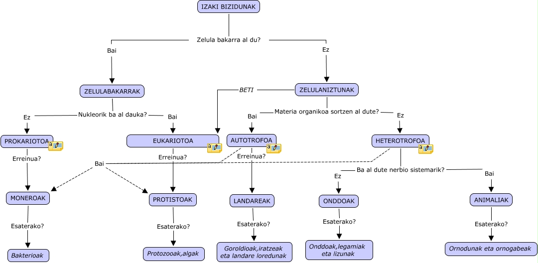Este Cmap, tiene información relacionada con: Izaki bizidunak, IZAKI BIZIDUNAK Zelula bakarra al du? ZELULANIZTUNAK, AUTOTROFOA Bai PROTISTOAK, ZELULANIZTUNAK BETI EUKARIOTOA, LANDAREAK Esaterako? Goroldioak,iratzeak eta landare loredunak, HETEROTROFOA Ba al dute nerbio sistemarik? ONDDOAK, AUTOTROFOA Bai MONEROAK, HETEROTROFOA Ba al dute nerbio sistemarik? ANIMALIAK, MONEROAK Esaterako? Bakterioak, ANIMALIAK Esaterako? Ornodunak eta ornogabeak, PROTISTOAK Esaterako? Protozooak,algak, ZELULANIZTUNAK Materia organikoa sortzen al dute? AUTOTROFOA, ZELULANIZTUNAK Materia organikoa sortzen al dute? HETEROTROFOA, ONDDOAK Esaterako? Onddoak,legamiak eta lizunak, EUKARIOTOA Erreinua? PROTISTOAK, PROKARIOTOA Erreinua? MONEROAK, IZAKI BIZIDUNAK Zelula bakarra al du? ZELULABAKARRAK, HETEROTROFOA Bai MONEROAK, HETEROTROFOA Bai PROTISTOAK, AUTOTROFOA Erreinua? LANDAREAK