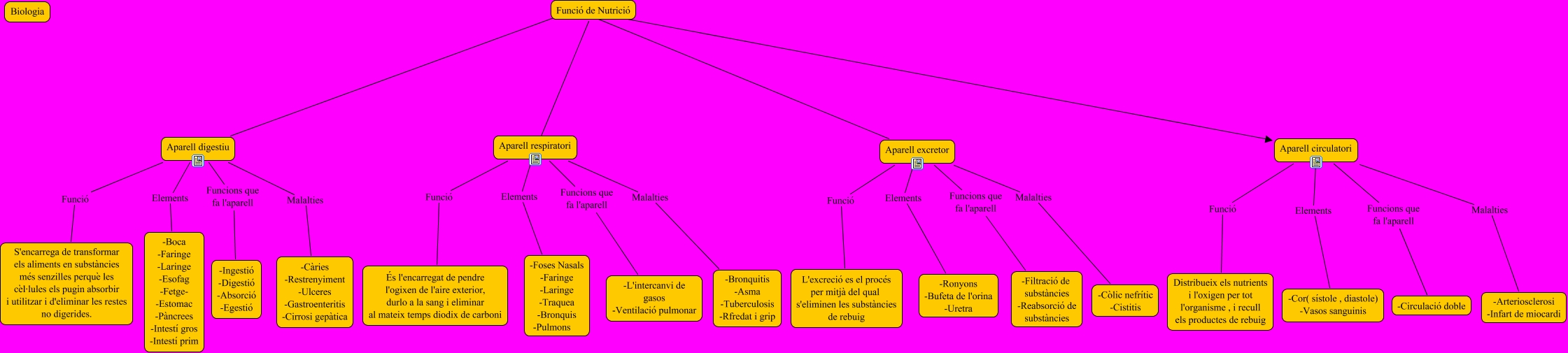 Aquest mapa conceptual conté informació relacionada amb: Funció de nutrició -Biologia, Aparell excretor Elements -Ronyons -Bufeta de l'orina -Uretra, Aparell digestiu Malalties -Càries -Restrenyiment -Ulceres -Gastroenteritis -Cirrosi gepàtica, Aparell excretor Funcions que fa l'aparell -Filtració de substàncies -Reabsorció de substàncies, Aparell respiratori Funció És l'encarregat de pendre l'ogixen de l'aire exterior, durlo a la sang i eliminar al mateix temps diodix de carboni, Aparell digestiu Funció S'encarrega de transformar els aliments en substàncies més senzilles perquè les cèl·lules els pugin absorbir i utilitzar i d'eliminar les restes no digerides., Aparell circulatori Malalties -Arteriosclerosi -Infart de miocardi, Funció de Nutrició ???? Aparell excretor, Aparell circulatori Funcions que fa l'aparell -Circulació doble, Aparell respiratori Malalties -Bronquitis -Asma -Tuberculosis -Rfredat i grip, Funció de Nutrició ???? Aparell digestiu, Aparell respiratori Funcions que fa l'aparell -L'intercanvi de gasos -Ventilació pulmonar, Aparell digestiu Elements -Boca -Faringe -Laringe -Esofag -Fetge- -Estomac -Pàncrees -Intestí gros -Intestí prim, Aparell circulatori Funció Distribueix els nutrients i l'oxigen per tot l'organisme , i recull els productes de rebuig, Funció de Nutrició ???? Aparell circulatori, Aparell excretor Malalties -Còlic nefrític -Cistitis, Funció de Nutrició ???? Aparell respiratori, Aparell digestiu Funcions que fa l'aparell -Ingestió -Digestió -Absorció -Egestió, Aparell circulatori Elements -Cor( sístole , diastole) -Vasos sanguinis, Aparell excretor Funció L'excreció es el procés per mitjà del qual s'eliminen les substàncies de rebuig, Aparell respiratori Elements -Foses Nasals -Faringe -Laringe -Traquea -Bronquis -Pulmons