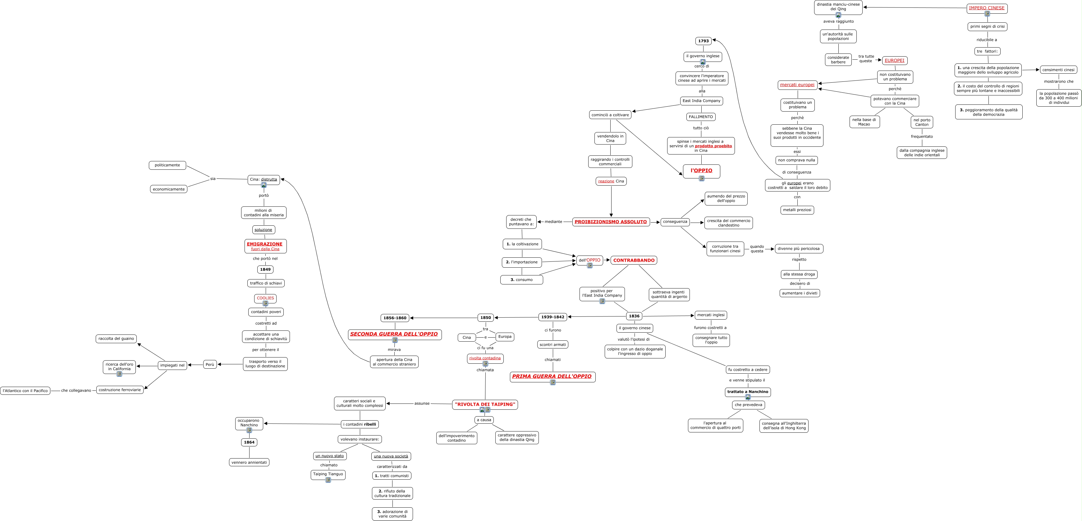 Questa Cmap, creata con IHMC CmapTools, contiene informazioni relative a: impero cinese, 1939-1842 1850, Cina: distrutta sia politicamente, una nuova società caratterizzati da 1. tratti comunisti, dell'OPPIO CONTRABBANDO, primi segni di crisi riducibile a tre fattori:, divenne più pericolosa rispetto alla stessa droga, 1939-1842 ci furono scontri armati, trattato a Nanchino che prevedeva, non comprava nulla di conseguenza gli europei erano costretti a saldare il loro debito, 3. consumo dell'OPPIO, potevano commerciare con la Cina nella base di Macao, 1850 tra Europa, 1864 vennero annientati, volevano instaurare: una nuova società, "RIVOLTA DEI TAIPING" a causa, reazione Cina PROIBIZIONISMO ASSOLUTO, 1. la coltivazione dell'OPPIO, gli europei erano costretti a saldare il loro debito con metalli preziosi, 2. rifiuto della cultura tradizionale 3. adorazione di varie comunità, apertura della Cina al commercio straniero Cina: distrutta