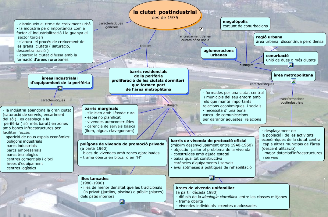 Este Cmap, tiene información relacionada con: tema9geogr3v4.cmap, aglomeracions urbanes distingim àrea metropolitana, àrea metropolitana transformacions postindustrials - desplaçament de la població i de les activitats econòmiques de la ciutat central cap a altres municipis de l'àrea (descentralització) - major dotaciód'infraestructures i serveis, barris residencials de la perifèria proliferació de les ciutats dormitori que formen part de l'àrea metroplitana distingim barris de vivenda de protecció oficial (màxim desenvolupament entre 1940-1960) - objectiu: paliar el problema de la vivenda - construïdes amb ajuda estatal - baixa qualitat constructiva - carències d'quipaments i serveis - avuí sotmeses a polítiques de rehabilitació, aglomeracions urbanes distingim regió urbana àrea urbana discontínua però densa, barris residencials de la perifèria proliferació de les ciutats dormitori que formen part de l'àrea metroplitana distingim polígons de vivenda de promoció privada (a partir 1960) - blocs de vivendes amb zones ajardinades - trama oberta en blocs o en "H", la ciutat postindustrial des de 1975 trobem àrees industrials i d'equipamient de la perifèria, barris residencials de la perifèria proliferació de les ciutats dormitori que formen part de l'àrea metroplitana distingim barris marginals - s'inicien amb l'èxode rural - espai no planificat - vivendes autoconstruïdes - carència de serveis bàsics (llum, aigua, clavegueram), barris residencials de la perifèria proliferació de les ciutats dormitori que formen part de l'àrea metroplitana distingim illes tancades (1980-1990) - illes de menor densitat que les tradicionals - ús privat (jardins, piscina) o públic (places) dels patis interiors, aglomeracions urbanes distingim megalòpolis conjunt de conurbacions, àrees industrials i d'equipamient de la perifèria característiques - la indústria abandona la gran ciutat (saturació de serveis, encariment del sòl) i es desplaça a la perifèria ( sòl més barat) en zones amb bones infraestructures per facilitar l'accés - aparició de nous espais econòmics: polígons industrials parcs industrials parcs empresarials parcs tecnològics centres comercials i d'oci àrees d'equipament centres logístics, la ciutat postindustrial des de 1975 el creixement de les ciutats dóna lloc a aglomeracions urbanes, la ciutat postindustrial des de 1975 trobem barris residencials de la perifèria proliferació de les ciutats dormitori que formen part de l'àrea metroplitana, aglomeracions urbanes distingim conurbació unió de dues o més ciutats, àrea metropolitana característiques - formades per una ciutat central i municipis del seu entorn amb els que manté importants relacions econòmiques i socials - necessita d' una bona xarxa de comunicacions per garantir aquestes relacions, barris residencials de la perifèria proliferació de les ciutats dormitori que formen part de l'àrea metroplitana distingim àrees de vivenda unifamiliar (a partir dècada 1980) - difusió de la ideologia clorofílica entre les classes mitjanes - trama oberta - vivendes individuals exentes o adossades, la ciutat postindustrial des de 1975 característiques generals - disminueix el ritme de creiximent urbà - la indústria perd importància com a factor d' industrialització i la guanya el sector terciari - s'atura el procés de creixement de les grans ciutats ( saturació, descentralizació ) - apareix la ciutat difussa amb la formació d'àrees rururbanes
