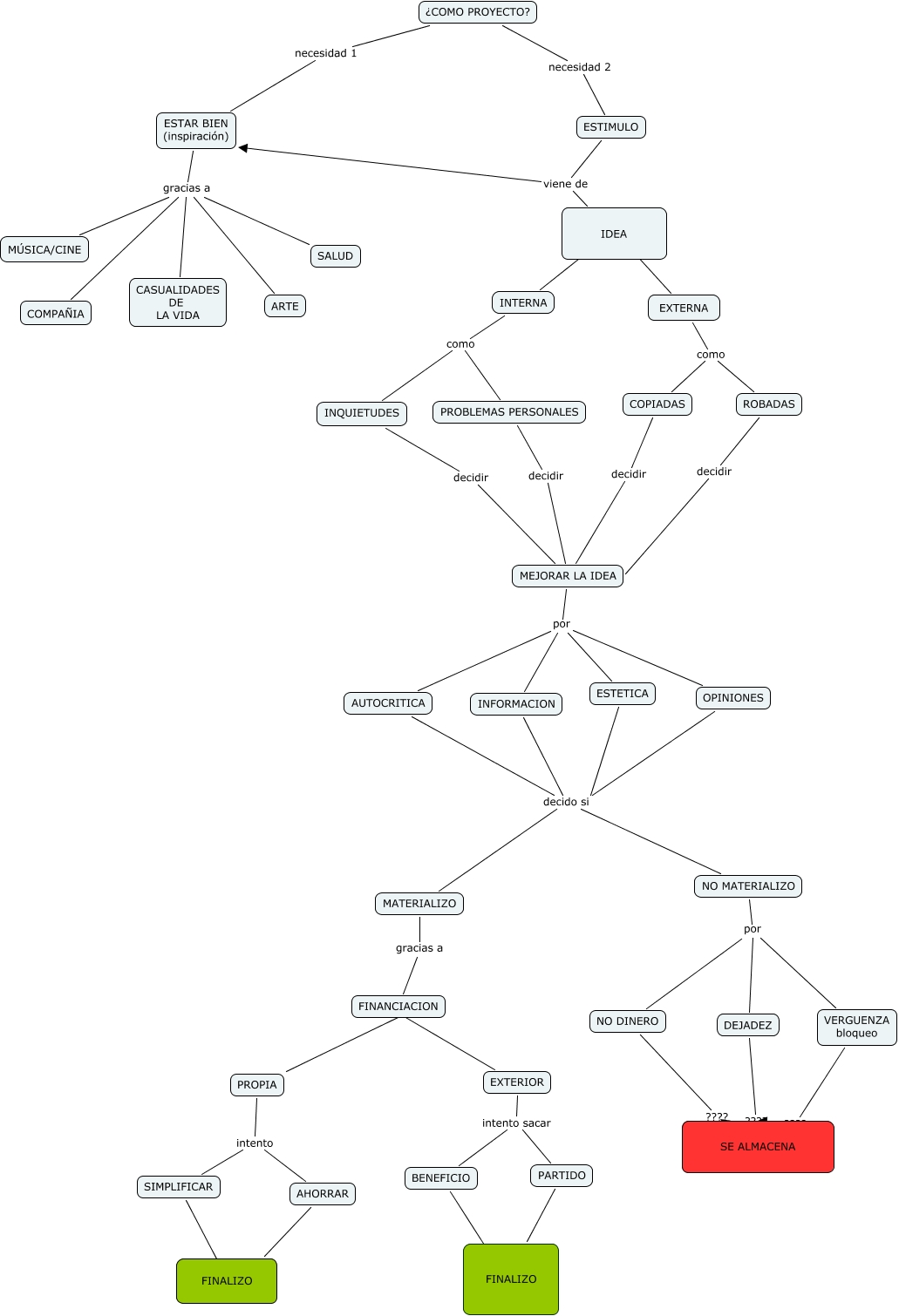 Este Cmap, tiene información relacionada con: mapa, OPINIONES decido si NO MATERIALIZO, ¿COMO PROYECTO? necesidad 1 ESTAR BIEN (inspiración), PROPIA intento SIMPLIFICAR, PROPIA intento AHORRAR, MEJORAR LA IDEA por OPINIONES, ESTAR BIEN (inspiración) gracias a COMPAÑIA, INQUIETUDES decidir MEJORAR LA IDEA, EXTERIOR intento sacar PARTIDO, AHORRAR ???? FINALIZO, ESTAR BIEN (inspiración) gracias a ARTE, ESTIMULO viene de ESTAR BIEN (inspiración), NO MATERIALIZO por VERGUENZA bloqueo, INTERNA como INQUIETUDES, BENEFICIO ???? FINALIZO, BENEFICIO ???? FINALIZO, ESTAR BIEN (inspiración) gracias a CASUALIDADES DE LA VIDA, ESTAR BIEN (inspiración) gracias a MÚSICA/CINE, ROBADAS decidir MEJORAR LA IDEA, DEJADEZ ???? SE ALMACENA, EXTERNA como ROBADAS