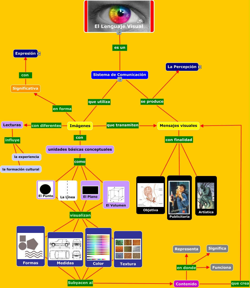 Este Cmap, tiene información relacionada con: Mapa Conceptual_El Lenguaje Visual, unidades básicas conceptuales como La Línea, La Línea visualizan Medidas, Imágenes con unidades básicas conceptuales, El Plano visualizan Medidas, El Volumen visualizan Color, Imágenes con diferentes Lecturas, Lecturas influye la experiencia, Receptor que los Interpreta, Formas Subyacen al Contenido, Mensajes visuales con finalidad Artística, El Punto visualizan Formas, El Plano visualizan Textura, El Punto visualizan Textura, Expresión con estilo abstracta, Contenido en donde Significa, Significativa con Expresión, Sistema de Comunicación que utiliza Imágenes, Medidas Subyacen al Contenido, Expresión con estilo realista, El Plano visualizan Formas