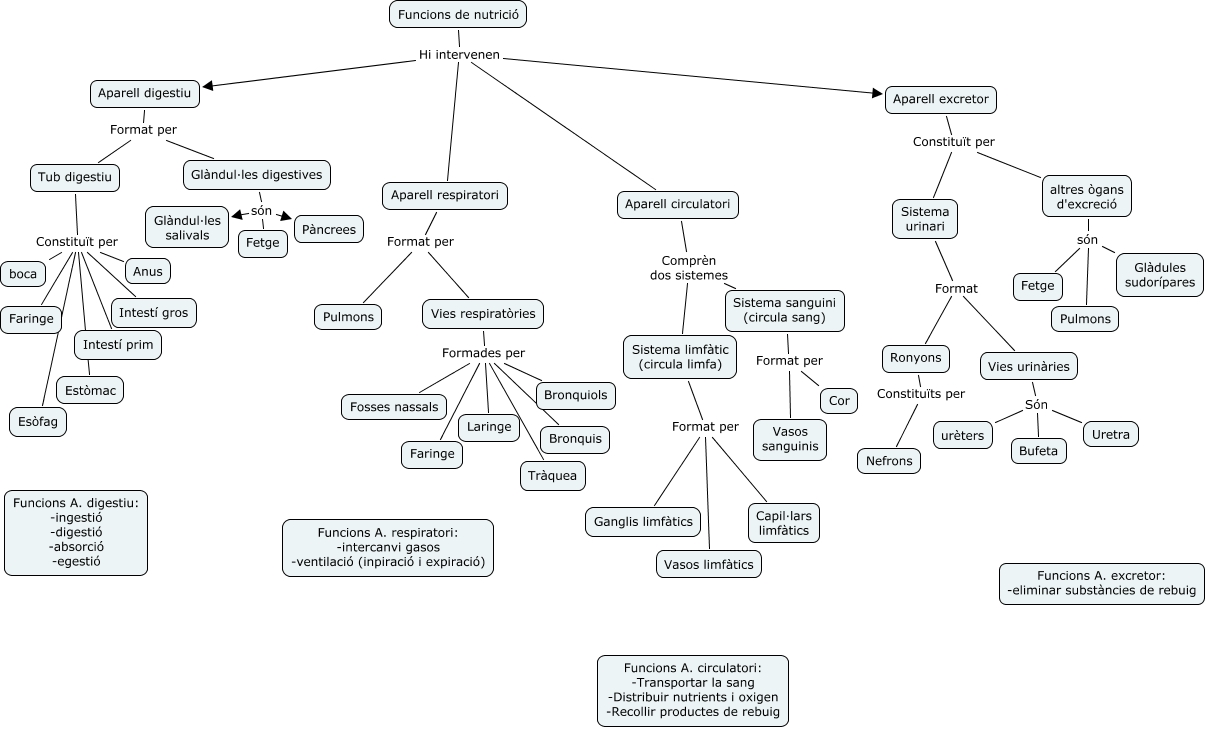 Aquest mapa conceptual conté informació relacionada amb: Funcions de nutrició, Vies urinàries Són urèters, Tub digestiu Constituït per Faringe, Tub digestiu Constituït per Intestí gros, Sistema urinari Format Vies urinàries, altres ògans d'excreció són Fetge, Sistema sanguini (circula sang) Format per Vasos sanguinis, Ronyons Constituïts per Nefrons, Vies respiratòries Formades per Fosses nassals, Funcions de nutrició Hi intervenen Aparell respiratori, Aparell excretor Constituït per altres ògans d'excreció, Vies respiratòries Formades per Laringe, Tub digestiu Constituït per Anus, Tub digestiu Constituït per boca, Aparell digestiu Format per Tub digestiu, altres ògans d'excreció són Pulmons, Glàndul·les digestives són Glàndul·les salivals, Vies respiratòries Formades per Bronquiols, Sistema limfàtic (circula limfa) Format per Vasos limfàtics, Vies urinàries Són Bufeta, Sistema limfàtic (circula limfa) Format per Capil·lars limfàtics