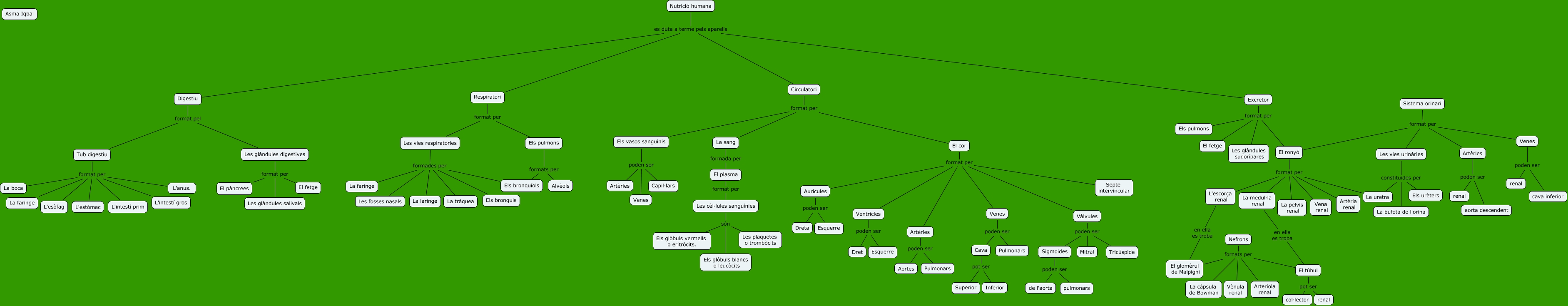 This Concept Map, created with IHMC CmapTools, has information related to: La funció de nutrició, Tub digestiu format per L'esòfag, La sang formada per El plasma, Les vies respiratòries formades per Les fosses nasals, Aurícules poden ser Esquerre, Nutrició humana es duta a terme pels aparells Respiratori, Nefrons fornats per Arteriola renal, El cor format per Artèries, Ventricles poden ser Dret, El túbul pot ser renal, Venes poden ser cava inferior, Cava pot ser Superior, Sistema orinari format per Les vies urinàries, El ronyó format per Artèria renal, Excretor format per El ronyó, El cor format per Septe intervincular, Els pulmons formats per Alvèols, El ronyó format per La pelvis renal, Nefrons fornats per Vènula renal, Les glàndules digestives format per El fetge, Les vies urinàries constituïdes per La bufeta de l'orina