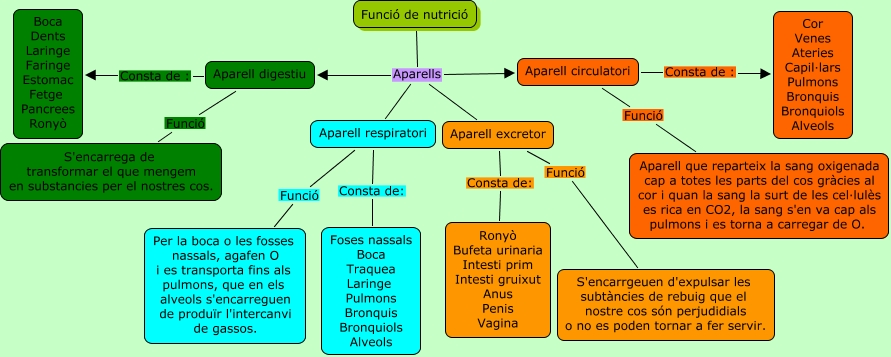 Aquest mapa conceptual conté informació relacionada amb: Biologia, Funció de nutrició Aparells Aparell respiratori, Funció de nutrició Aparells Aparell digestiu, Aparell respiratori Funció Per la boca o les fosses nassals, agafen O i es transporta fins als pulmons, que en els alveols s'encarreguen de produïr l'intercanvi de gassos., Funció de nutrició Aparells Aparell circulatori, Aparell excretor Consta de: Ronyò Bufeta urinaria Intesti prim Intesti gruixut Anus Penis Vagina, Aparell circulatori Consta de : Cor Venes Ateries Capil·lars Pulmons Bronquis Bronquiols Alveols, Aparell digestiu Funció S'encarrega de transformar el que mengem en substancies per el nostres cos., Aparell respiratori Consta de: Foses nassals Boca Traquea Laringe Pulmons Bronquis Bronquiols Alveols, Aparell excretor Funció S'encarrgeuen d'expulsar les subtàncies de rebuig que el nostre cos són perjudidials o no es poden tornar a fer servir., Aparell digestiu Consta de : Boca Dents Laringe Faringe Estomac Fetge Pancrees Ronyò, Aparell circulatori Funció Aparell que reparteix la sang oxigenada cap a totes les parts del cos gràcies al cor i quan la sang la surt de les cel·lulès es rica en CO2, la sang s'en va cap als pulmons i es torna a carregar de O., Funció de nutrició Aparells Aparell excretor