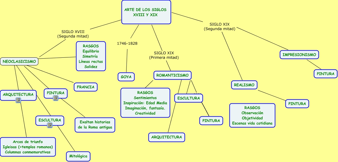 Este Cmap, tiene información relacionada con: Arte siglos XVIII y XIX, GOYA 1746-1828 ARTE DE LOS SIGLOS XVIII Y XIX, REALISMO SIGLO XIX (Segunda mitad) ARTE DE LOS SIGLOS XVIII Y XIX, ESCULTURA ???? ROMANTICISMO, IMPRESIONISMO SIGLO XIX (Segunda mitad) ARTE DE LOS SIGLOS XVIII Y XIX, ARTE DE LOS SIGLOS XVIII Y XIX SIGLO XVIII (Segunda mitad) NEOCLASICISMO, PINTURA ???? IMPRESIONISMO, ARQUITECTURA ???? ROMANTICISMO, RASGOS Equilibrio Simetría Líneas rectas Solidez ???? FRANCIA, PINTURA ???? ROMANTICISMO, ROMANTICISMO SIGLO XIX (Primera mitad) ARTE DE LOS SIGLOS XVIII Y XIX, PINTURA ???? REALISMO, NEOCLASICISMO ???? Exaltan historias de la Roma antigua, RASGOS Sentimientos Inspiración: Edad Media Imaginación, fantasía. Creatividad ???? ROMANTICISMO