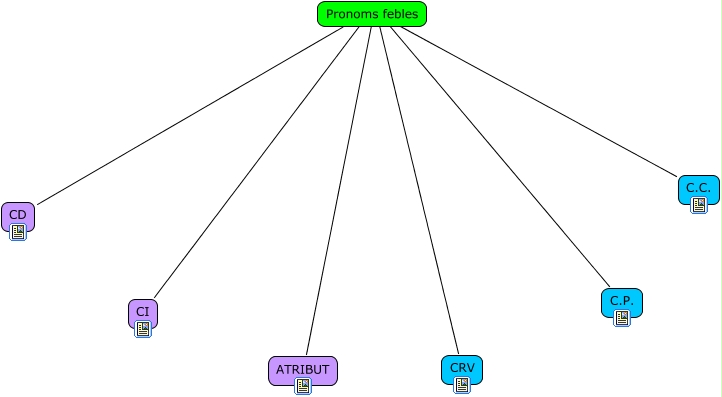 Aquest mapa conceptual conté informació relacionada amb: pronoms febles, CD ???? Pronoms febles, Pronoms febles ???? C.C., Pronoms febles ???? CRV, Pronoms febles ???? ATRIBUT, Pronoms febles ???? CI, Pronoms febles ???? C.P.