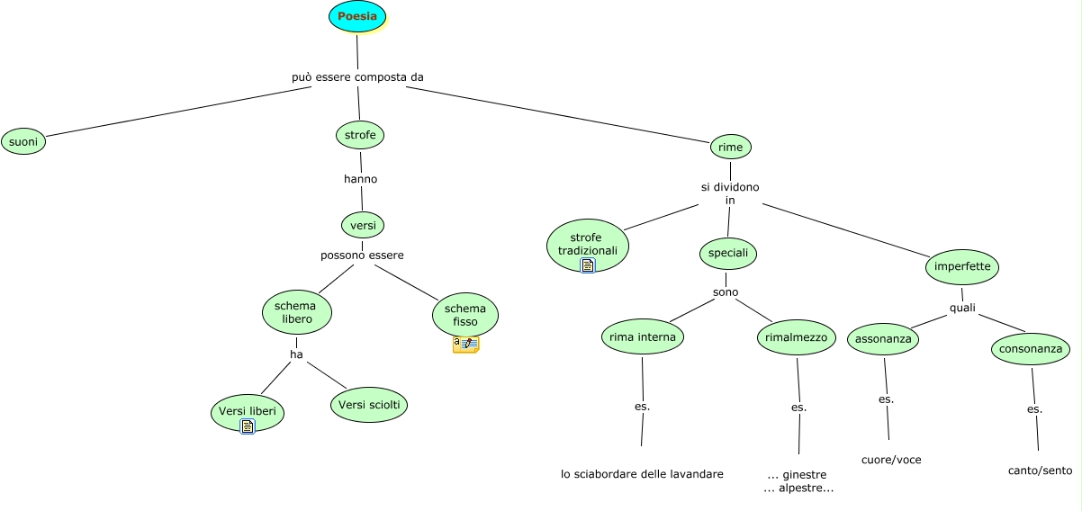 Questa Cmap, creata con IHMC CmapTools, contiene informazioni relative a: poesia, rima interna es. lo sciabordare delle lavandare, imperfette quali consonanza, rime si dividono in imperfette, Poesia può essere composta da strofe, imperfette quali assonanza, Poesia può essere composta da suoni, Poesia può essere composta da rime, schema libero ha Versi sciolti, rime si dividono in strofe tradizionali, assonanza es. cuore/voce, speciali sono rimalmezzo, consonanza es. canto/sento, versi possono essere schema fisso, speciali sono rima interna, versi possono essere schema libero, strofe hanno versi, rimalmezzo es. ... ginestre ... alpestre..., schema libero ha Versi liberi, rime si dividono in speciali