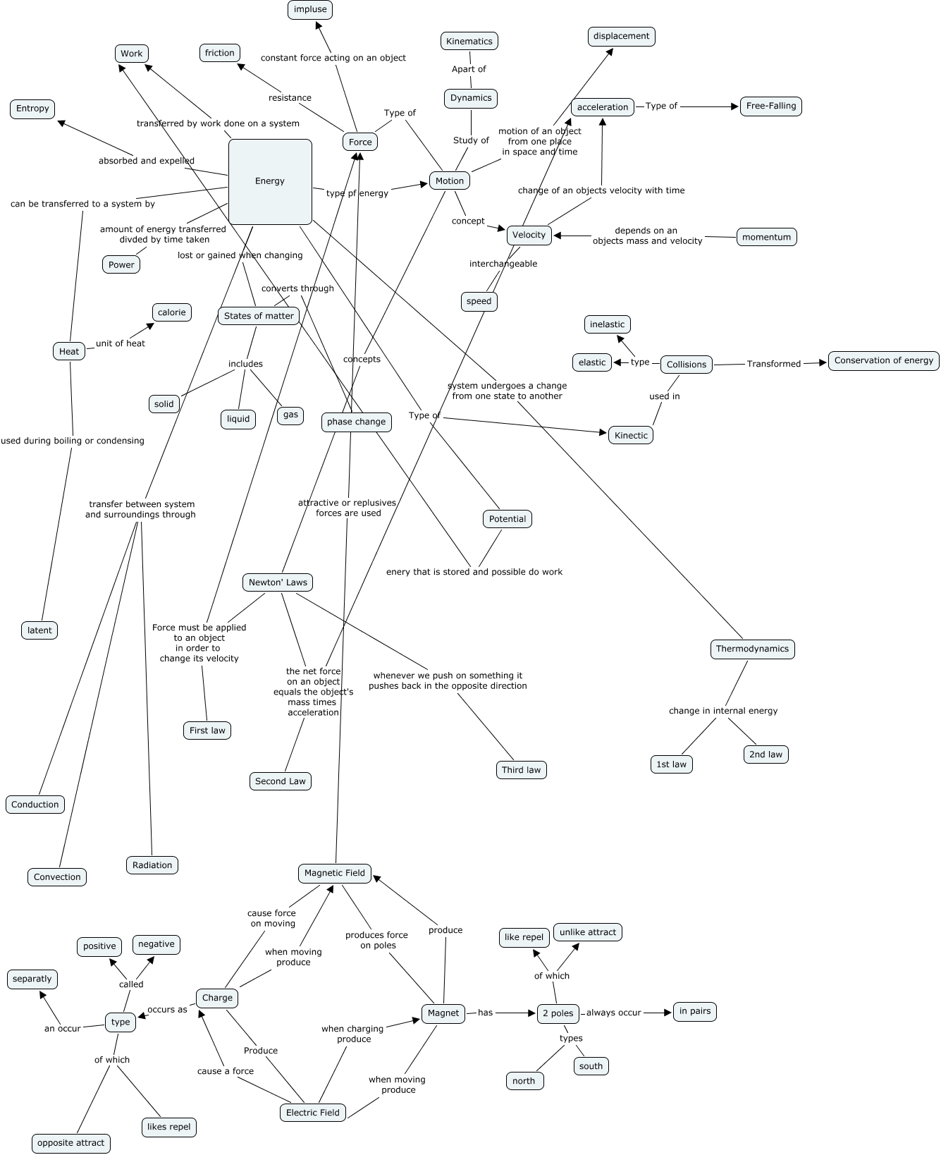 This Concept Map, created with IHMC CmapTools, has information related to: c.randle _energy, Potential enery that is stored and possible do work Work, Charge occurs as type, Magnet when moving produce Electric Field, type an occur separatly, Collisions type inelastic, Charge when moving produce Magnetic Field, Electric Field cause a force Charge, 2 poles always occur in pairs, 2 poles of which unlike attract, Heat unit of heat calorie, 2 poles types south, Newton' Laws the net force on an object equals the object's mass times acceleration acceleration, Thermodynamics change in internal energy 1st law, Collisions Transformed Conservation of energy, Magnetic Field cause force on moving Charge, Thermodynamics change in internal energy 2nd law, Kinematics Apart of Dynamics, Force constant force acting on an object impluse, Dynamics Study of Motion, States of matter includes gas