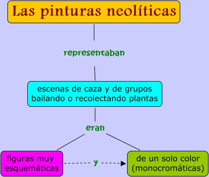 Este Cmap, tiene información relacionada con: Las pinturas neolíticas, figuras muy esquemáticas y de un solo color (monocromáticas), escenas de caza y de grupos bailando o recolectando plantas eran de un solo color (monocromáticas), Las pinturas neolíticas representaban escenas de caza y de grupos bailando o recolectando plantas, escenas de caza y de grupos bailando o recolectando plantas eran figuras muy esquemáticas