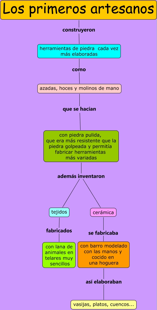 Este Cmap, tiene información relacionada con: Los primeros artesanos, Los primeros artesanos construyeron herramientas de piedra cada vez más elaboradas, con piedra pulida, que era más resistente que la piedra golpeada y permitía fabricar herramientas más variadas además inventaron tejidos, con barro modelado con las manos y cocido en una hoguera así elaboraban vasijas, platos, cuencos..., cerámica se fabricaba con barro modelado con las manos y cocido en una hoguera, con piedra pulida, que era más resistente que la piedra golpeada y permitía fabricar herramientas más variadas además inventaron cerámica, herramientas de piedra cada vez más elaboradas como azadas, hoces y molinos de mano, azadas, hoces y molinos de mano que se hacían con piedra pulida, que era más resistente que la piedra golpeada y permitía fabricar herramientas más variadas, tejidos fabricados con lana de animales en telares muy sencillos