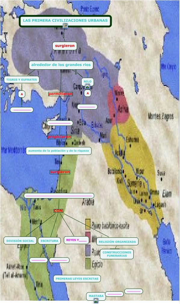 Este Cmap, tiene información relacionada con: PRIMERAS CIVILIZACIONES URBANAS, alrededor de los grandes rios NILO, alrededor de los grandes rios ???? TIGRIS Y EUFRATES, RELIGIÓN ORGANIZADA ???? CONSTRUCCIONES FUNERARIAS, __________________________________ CON REYES Y____, __________________________________ CON ESCRITURA, aumento de la población y de la riqueza surgieron __________________________________, __________________________________ CON RELIGIÓN ORGANIZADA, TIGRIS Y EUFRATES A, alrededor de los grandes rios permitieron ___________, A _________, LAS PRIMERA CIVILIZACIONES URBANAS surgieron, TIGRIS Y EUFRATES A, ___________ propiciaron aumento de la población y de la riqueza, __________________________________ CON DIVISIÓN SOCIAL, ESCRITURA _______, alrededor de los grandes rios NILO