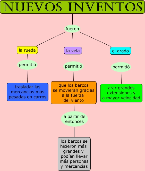Este Cmap, tiene información relacionada con: Nuevos inventos, Nuevos inventos fueron el arado, la vela permitió que los barcos se movieran gracias a la fuerza del viento, Nuevos inventos fueron la rueda, la rueda permitió trasladar las mercancías más pesadas en carros, que los barcos se movieran gracias a la fuerza del viento a partir de entonces los barcos se hicieron más grandes y podían llevar más personas y mercancías, el arado permitió arar grandes extensiones y a mayor velocidad, Nuevos inventos fueron la vela