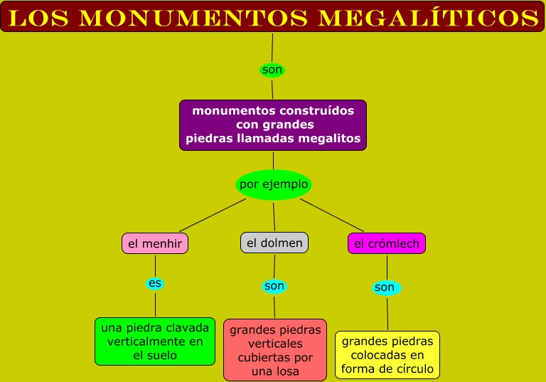 Este Cmap, tiene información relacionada con: Los monumentos megalíticos, monumentos construídos con grandes piedras llamadas megalitos por ejemplo el menhir, monumentos construídos con grandes piedras llamadas megalitos por ejemplo el dolmen, monumentos construídos con grandes piedras llamadas megalitos por ejemplo el crómlech, el dolmen son grandes piedras verticales cubiertas por una losa, el menhir es una piedra clavada verticalmente en el suelo, el crómlech son grandes piedras colocadas en forma de círculo, Los monumentos megalíticos son monumentos construídos con grandes piedras llamadas megalitos