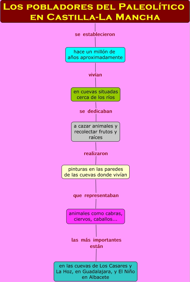 Este Cmap, tiene información relacionada con: Los pobladores del Paleolítico en Castilla-La Mancha, Los pobladores del Paleolítico en Castilla-La Mancha se establecieron hace un millón de años aproximadamente, pinturas en las paredes de las cuevas donde vivían que representaban animales como cabras, ciervos, caballos..., en cuevas situadas cerca de los ríos se dedicaban a cazar animales y recolectar frutos y raíces, a cazar animales y recolectar frutos y raíces realizaron pinturas en las paredes de las cuevas donde vivían, hace un millón de años aproximadamente vivían en cuevas situadas cerca de los ríos, animales como cabras, ciervos, caballos... las más importantes están en las cuevas de Los Casares y La Hoz, en Guadalajara, y El Niño en Albacete