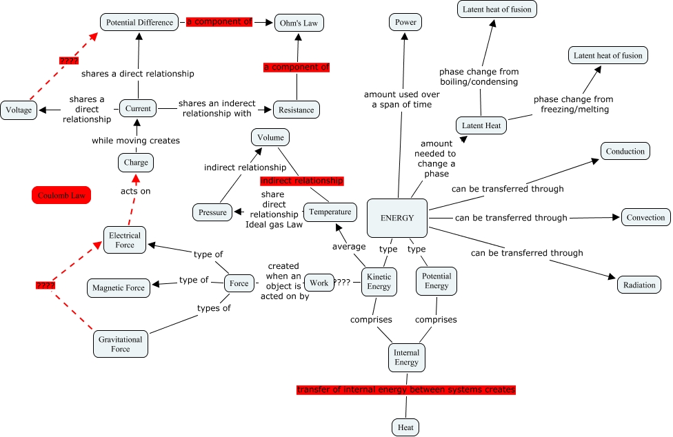 This Concept Map, created with IHMC CmapTools, has information related to: denzell cross_energy, Electrical Force acts on Charge, Current shares a direct relationship Potential Difference, ENERGY amount used over a span of time Power, Internal Energy transfer of internal energy between systems creates Heat, Kinetic Energy ???? Work, Gravitational Force ???? Electrical Force, Charge while moving creates Current, ENERGY type Kinetic Energy, ENERGY type Potential Energy, Voltage ???? Potential Difference, Pressure indirect relationship Volume, Volume indirect relationship Temperature, Potential Difference a component of Ohm's Law, Kinetic Energy comprises Internal Energy, Force type of Electrical Force, ENERGY can be transferred through Radiation, ENERGY amount needed to change a phase Latent Heat, Work created when an object is acted on by Force, Current shares a direct relationship Voltage, Latent Heat phase change from boiling/condensing Latent heat of fusion
